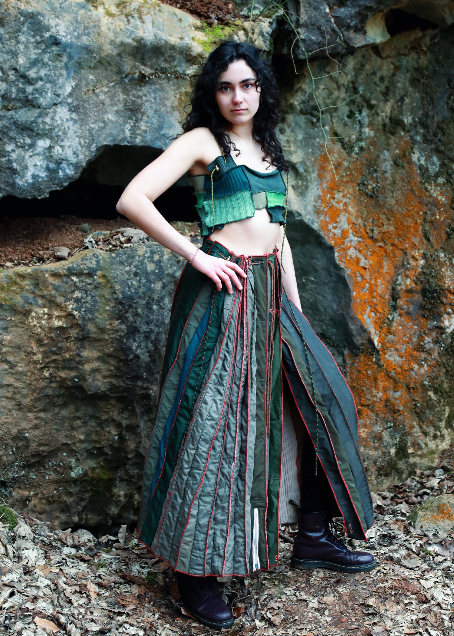 Der Gorp-Rock aus der Kollektion Survivors of the Future (SOTF) ist die ultimative Kombination aus Gorpcore und moderner Streetwear-Mode. Hergestellt aus recycelter Outdoor-Bekleidung mit einer auffälligen dystopischen Ästhetik. Nur in Grün oder wendbar in Grün und Braun erhältlich.