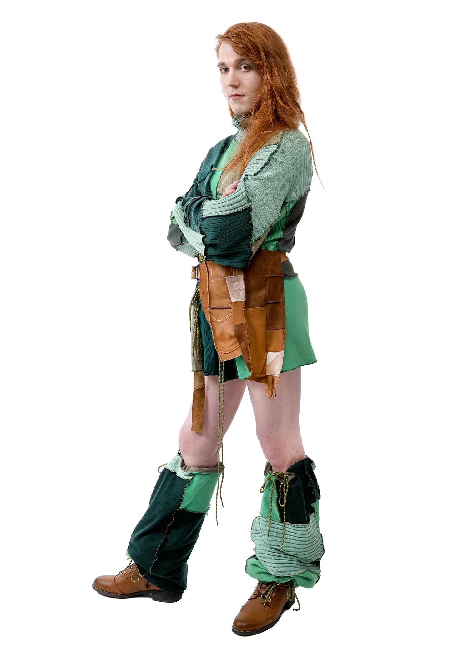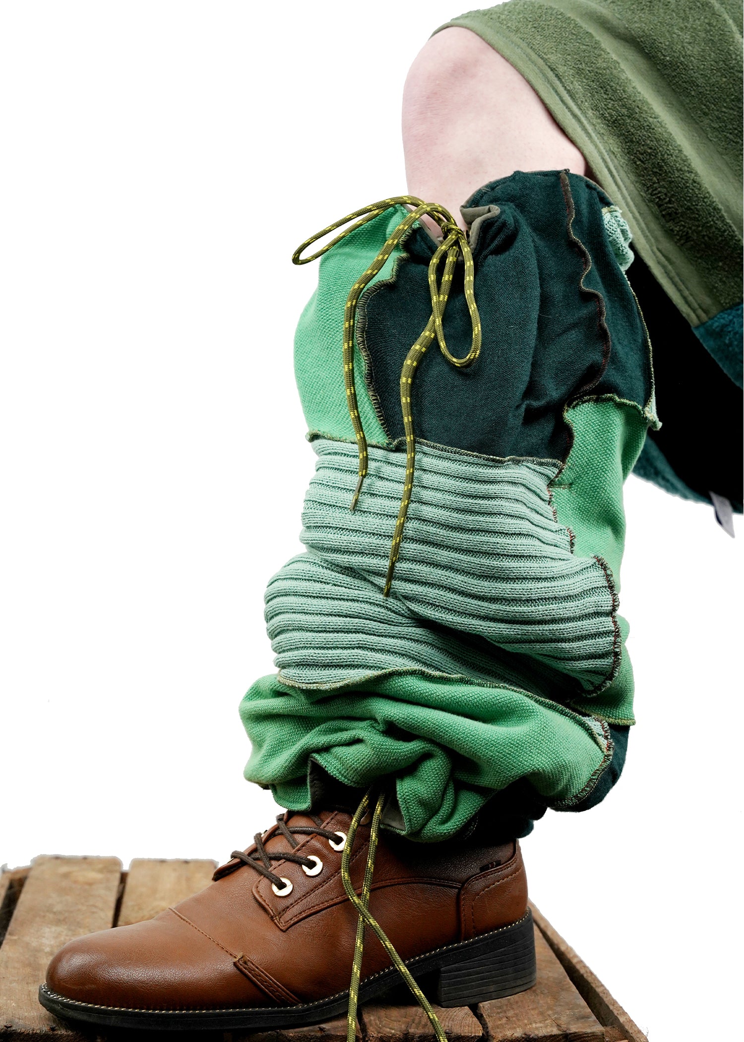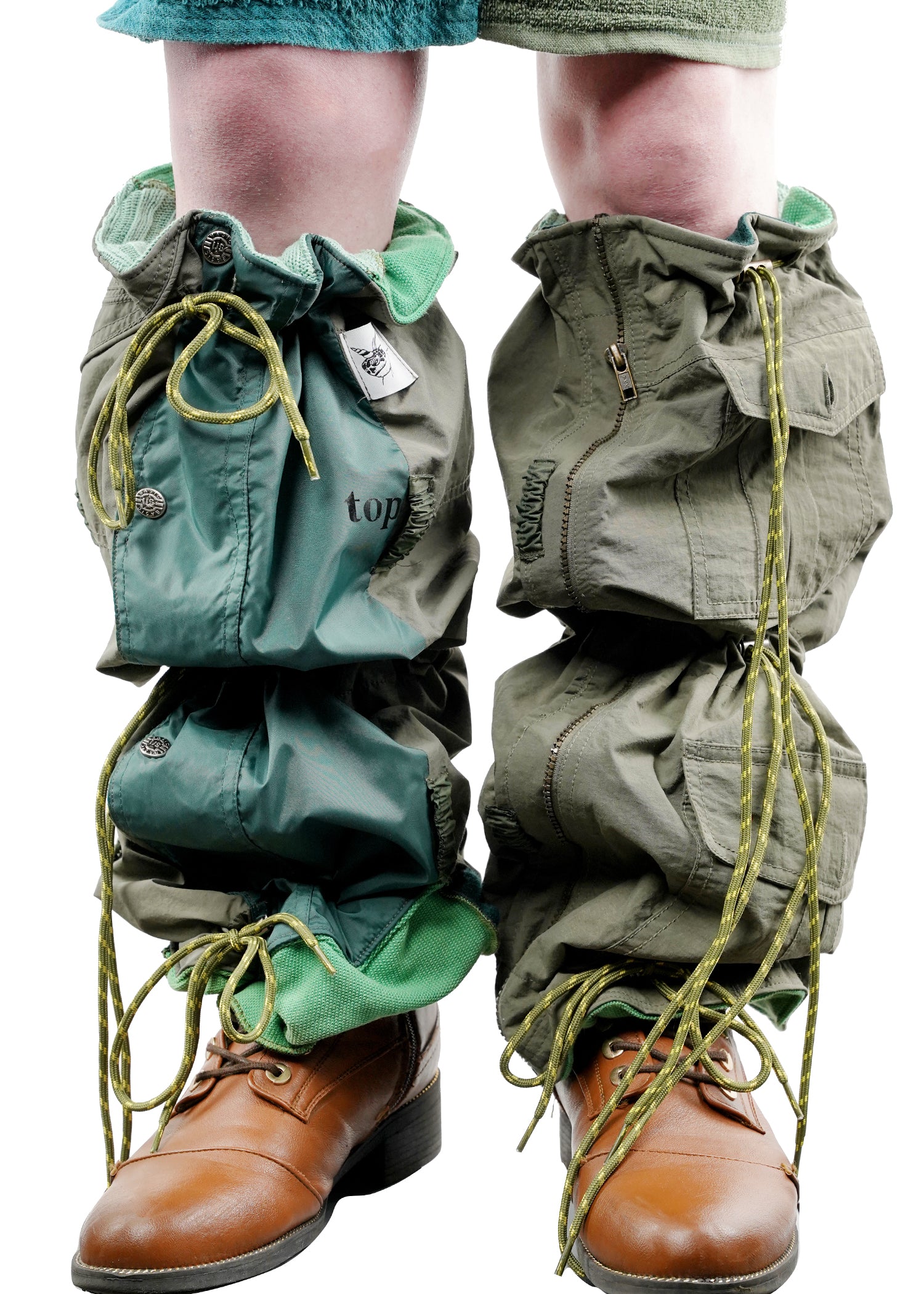 Diese besonderen Beinwärmer aus der Kollektion Survivors of the Future (SOTF) können auch in eine Handtasche verwandelt werden. Sie sind nur in Grüntönen und wendbar erhältlich und zeigen zwei Arten von Grüntönen aus Outdoor-Jacken und Strickwaren.