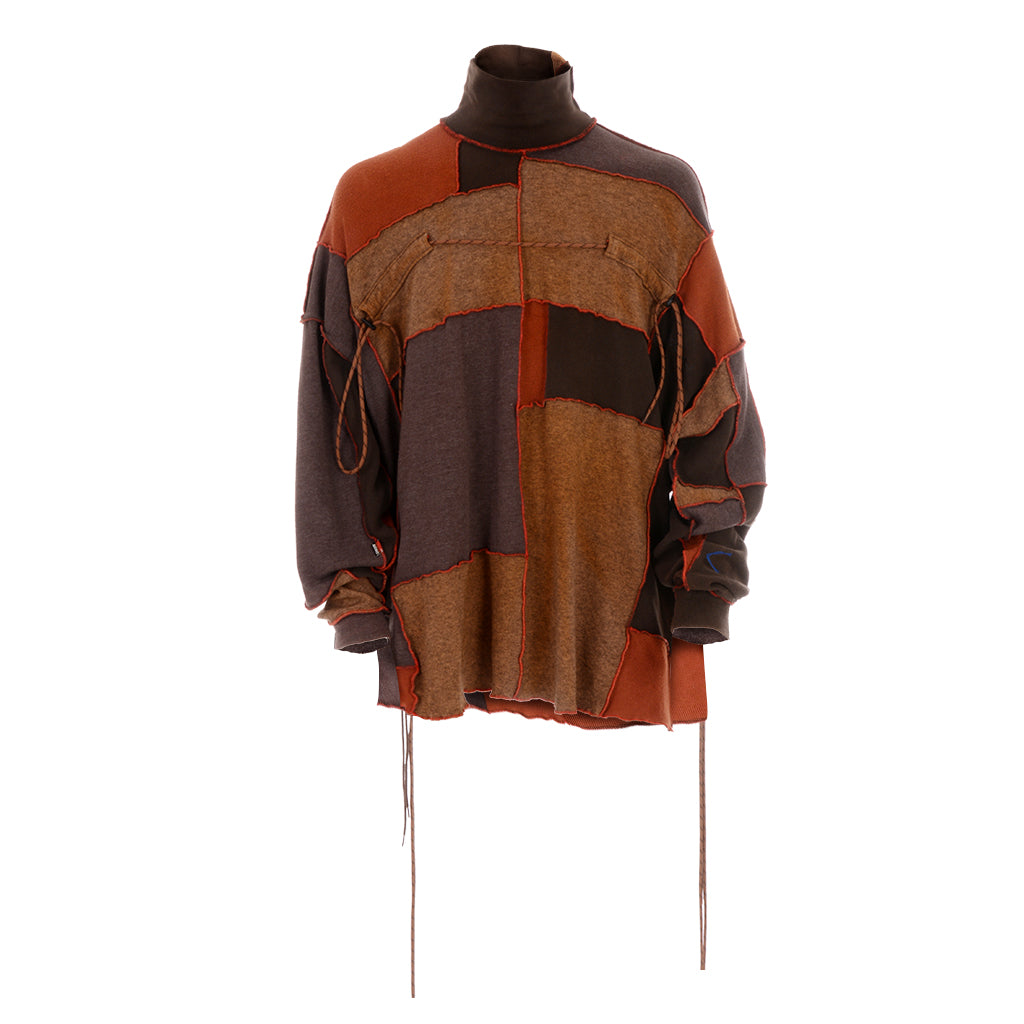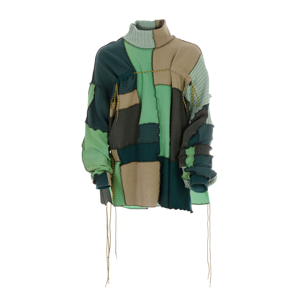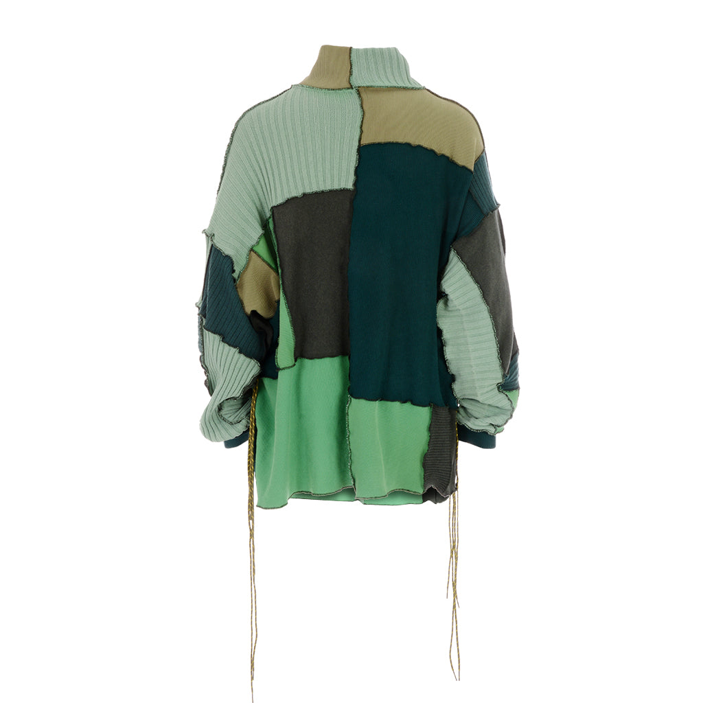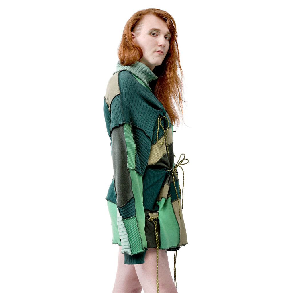 Das Patched Shirt ist ein einzigartiges Unisex-Kleidungsstück, das aus sortierter Strickware und Outdoor-Schnürsenkeln besteht. Es ist in den Farben Grün, Blau und Braun erhältlich und zeigt eine Reihe von Farbtönen wie irdische Landschaften über unserem Globus. Anpassbar mit Kordeln an Taille und Brust.