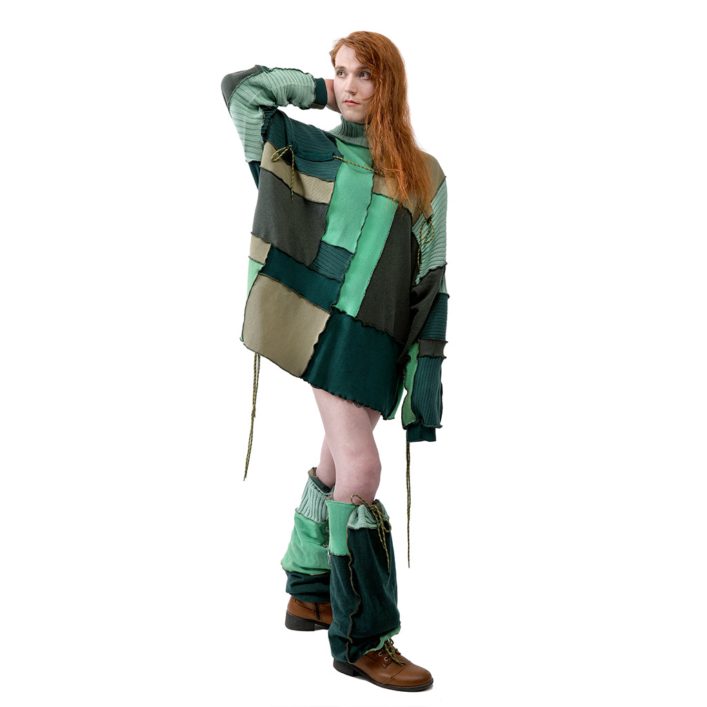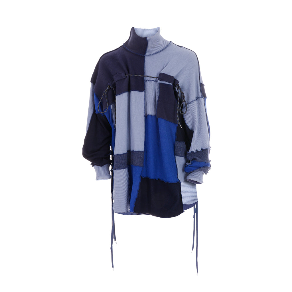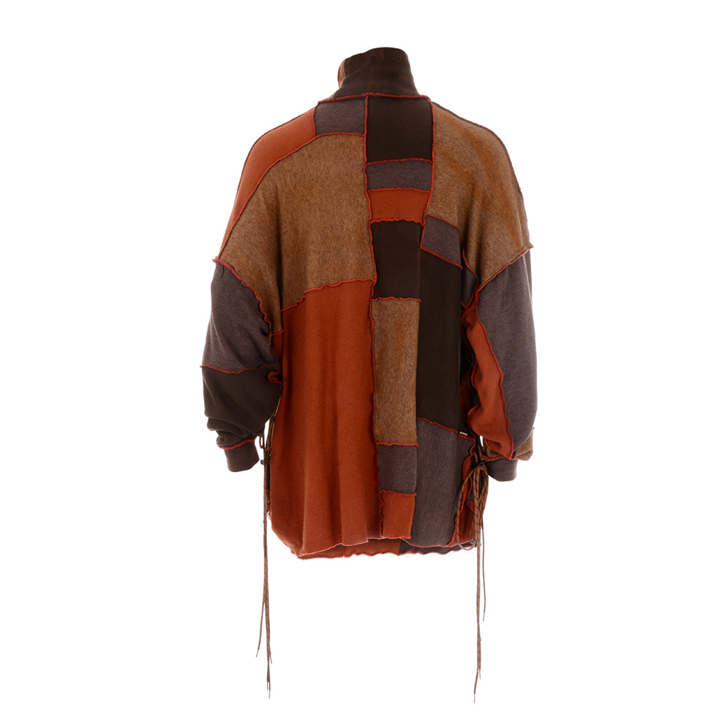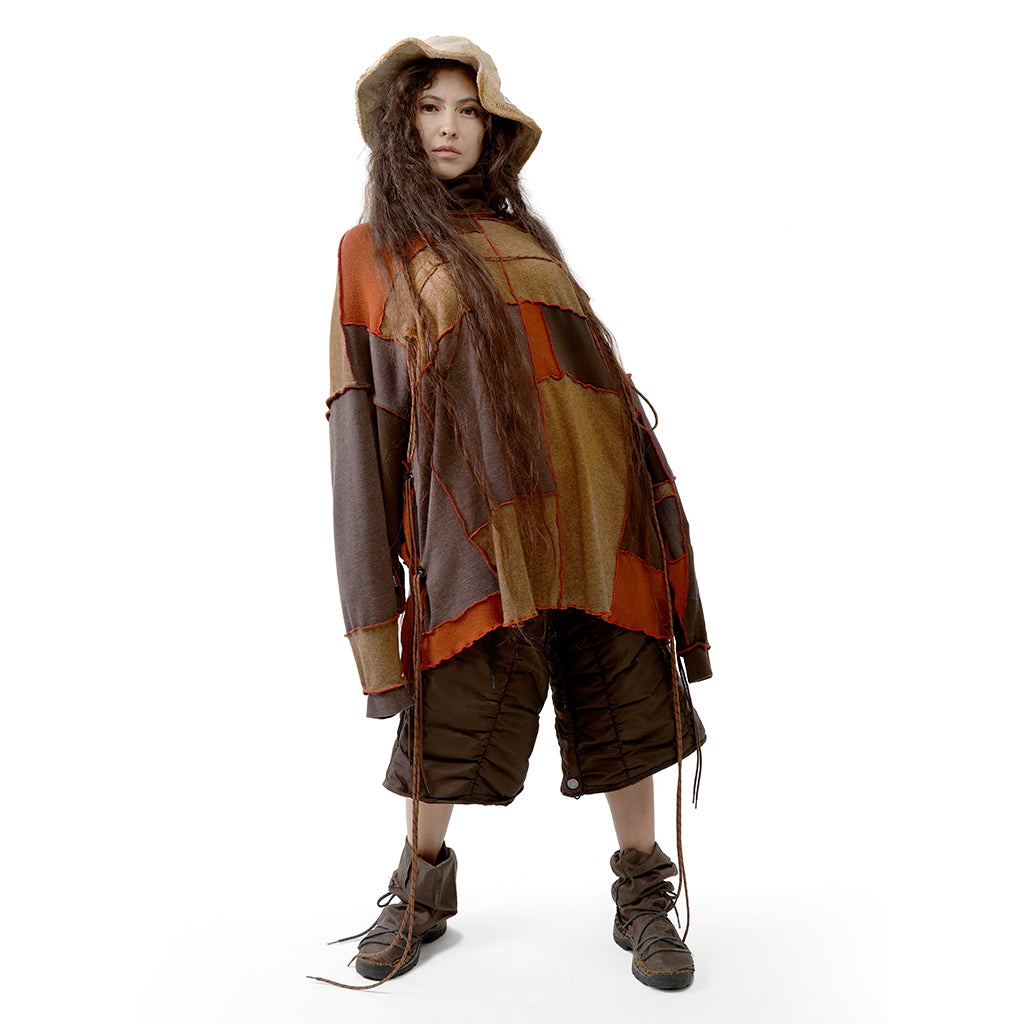 Das Patched Shirt ist ein einzigartiges Unisex-Kleidungsstück, das aus sortierter Strickware und Outdoor-Schnürsenkeln besteht. Es ist in den Farben Grün, Blau und Braun erhältlich und zeigt eine Reihe von Farbtönen wie irdische Landschaften über unserem Globus. Anpassbar mit Kordeln an Taille und Brust.