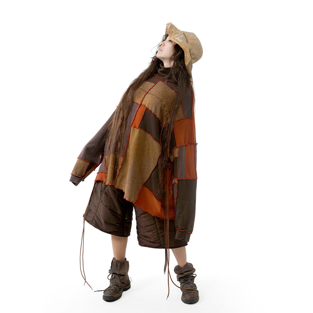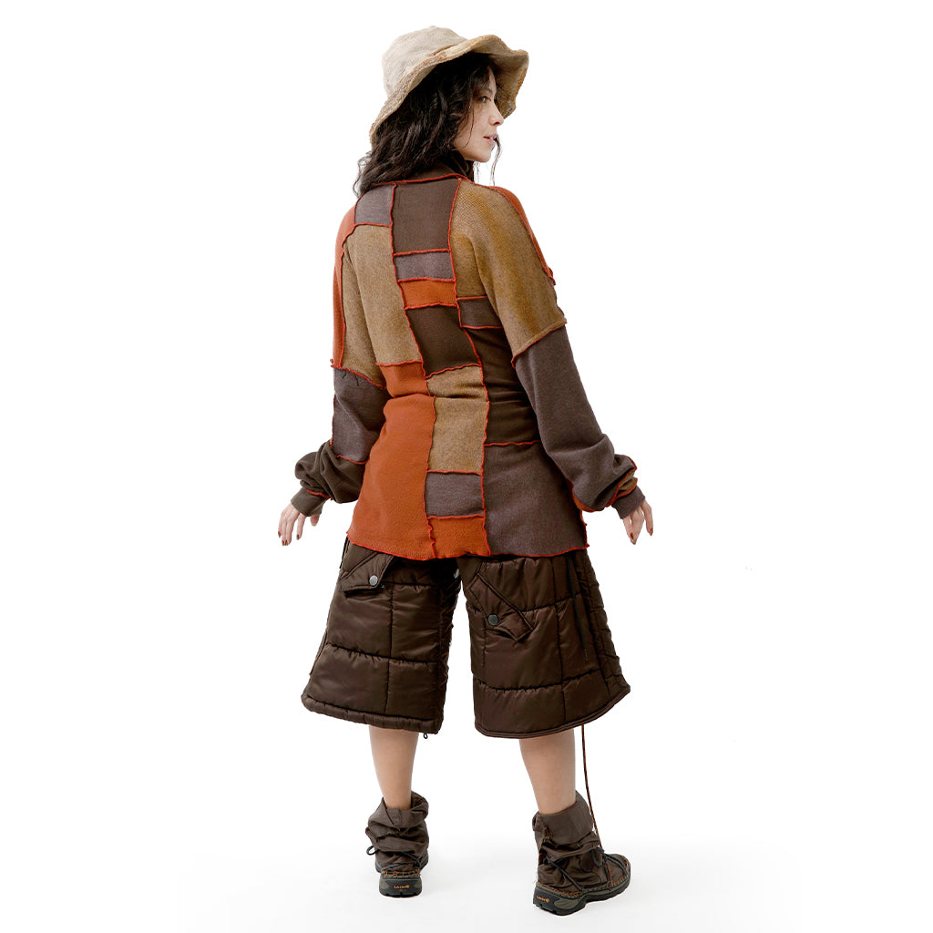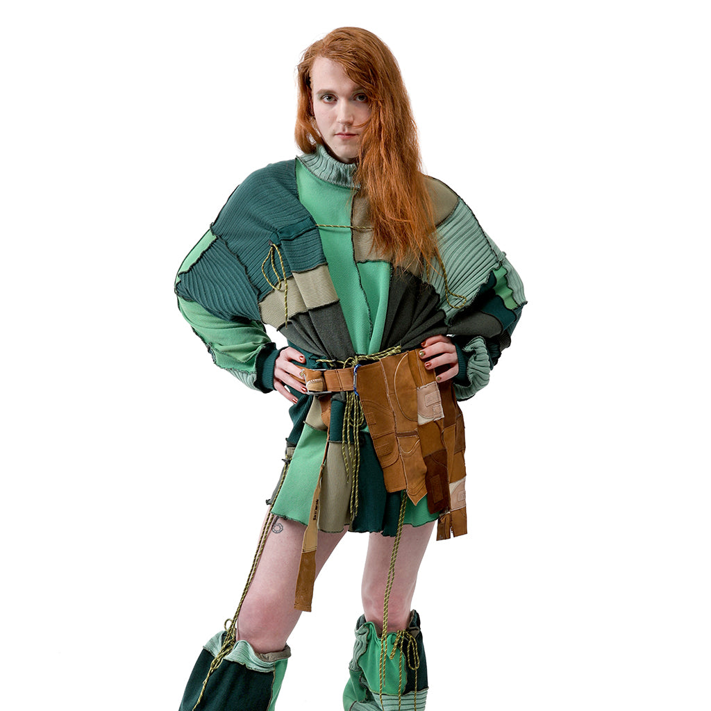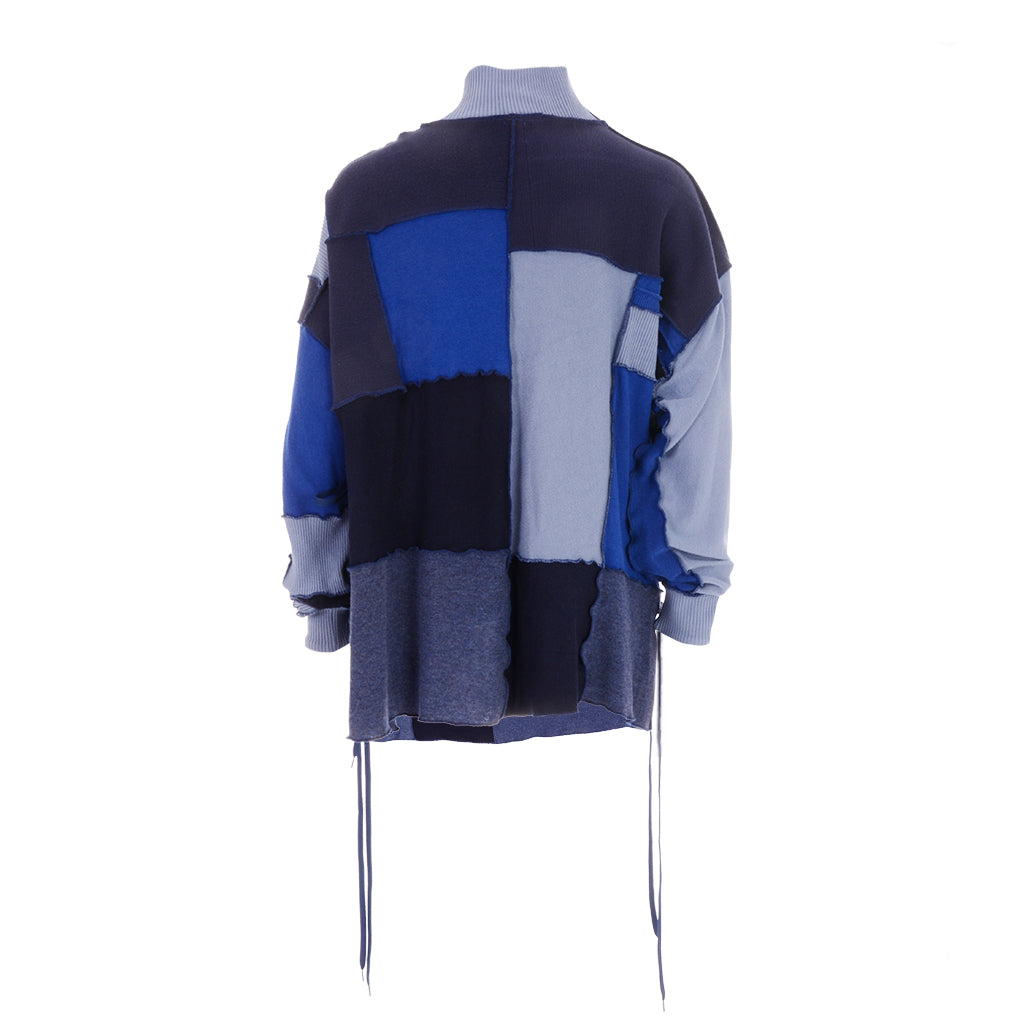 Das Patched Shirt ist ein einzigartiges Unisex-Kleidungsstück, das aus sortierter Strickware und Outdoor-Schnürsenkeln besteht. Es ist in den Farben Grün, Blau und Braun erhältlich und zeigt eine Reihe von Farbtönen wie irdische Landschaften über unserem Globus. Anpassbar mit Kordeln an Taille und Brust.