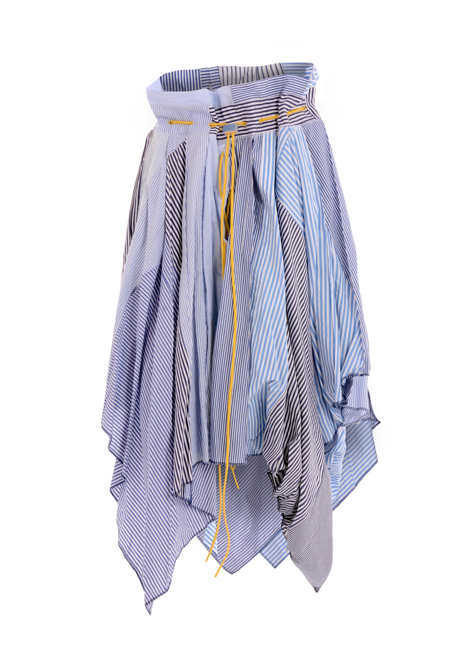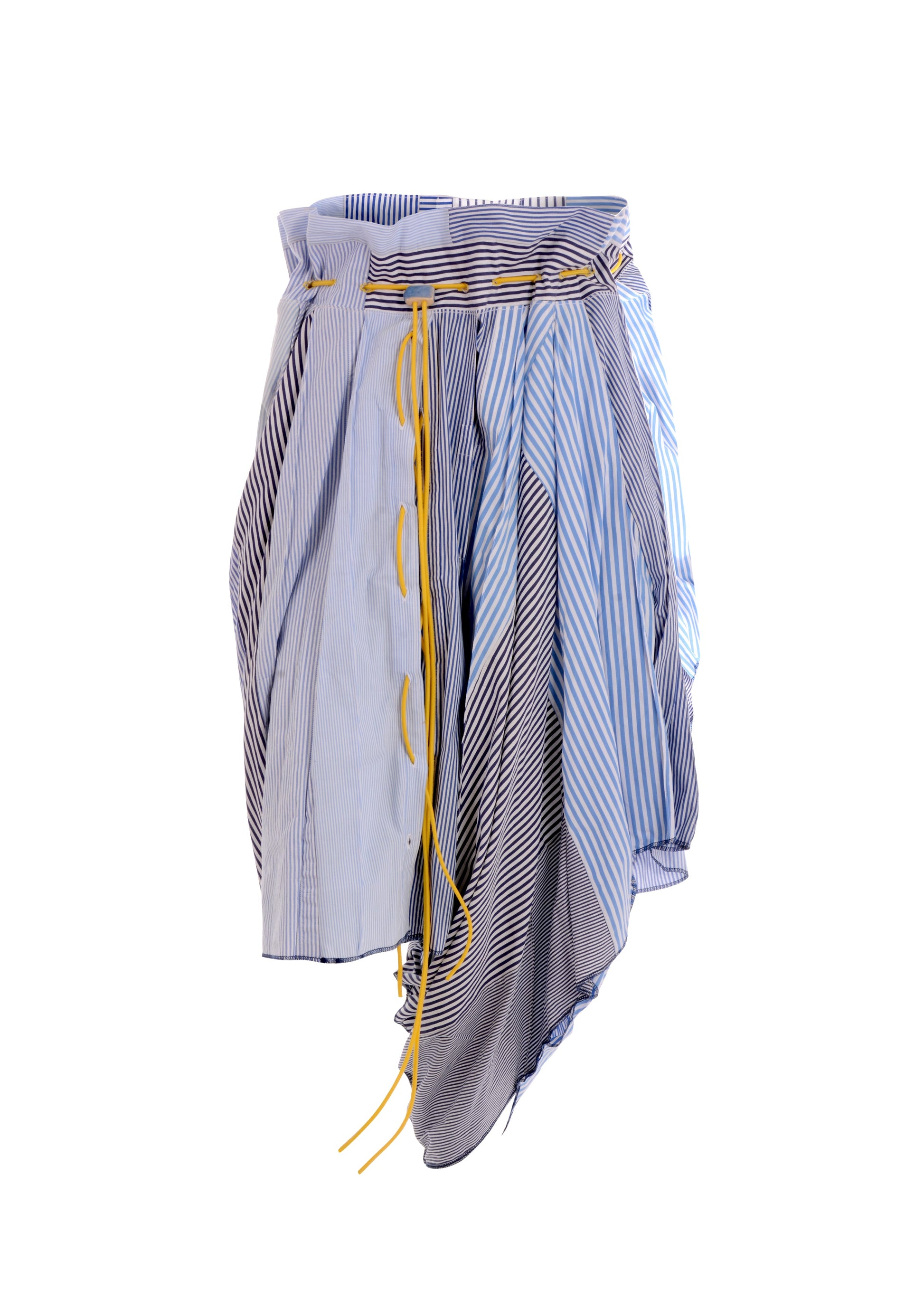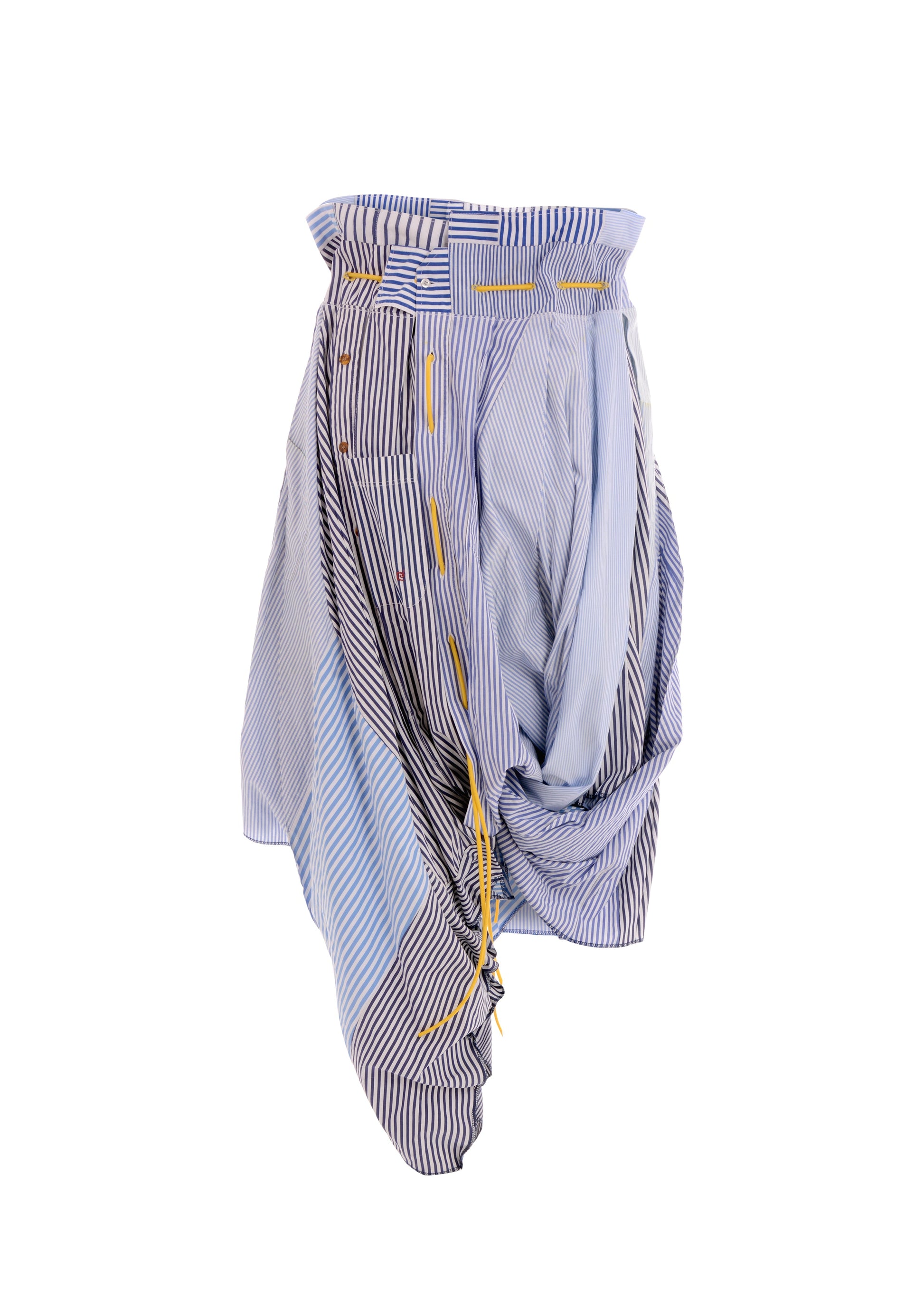 Die Petaled Rock-Hose aus der Kollektion LESS ist ein cooles, beeindruckendes Stück, das Sie als Rock oder Hose tragen und mit gelben Kordeln und Knöpfen anpassen können. Es besteht vollständig aus Reststoffen unserer textilen Konsumabfälle. Größtenteils aus Baumwolle und einem kleinen Anteil synthetischer Materialien, aus alten blau-weiß gestreiften Hemden. Jedes Stück ist ein Unikat, sieht aber nahezu identisch aus.
