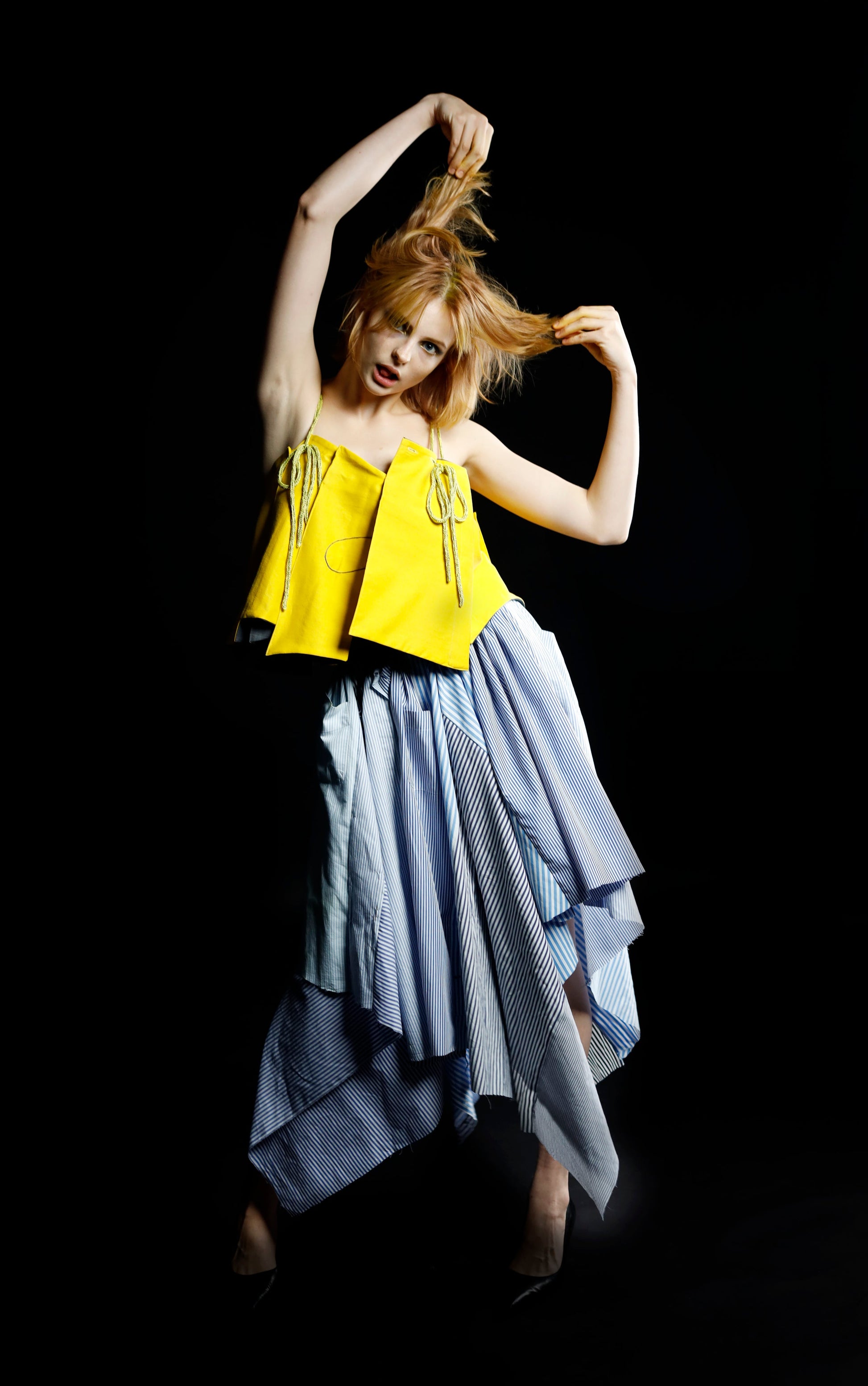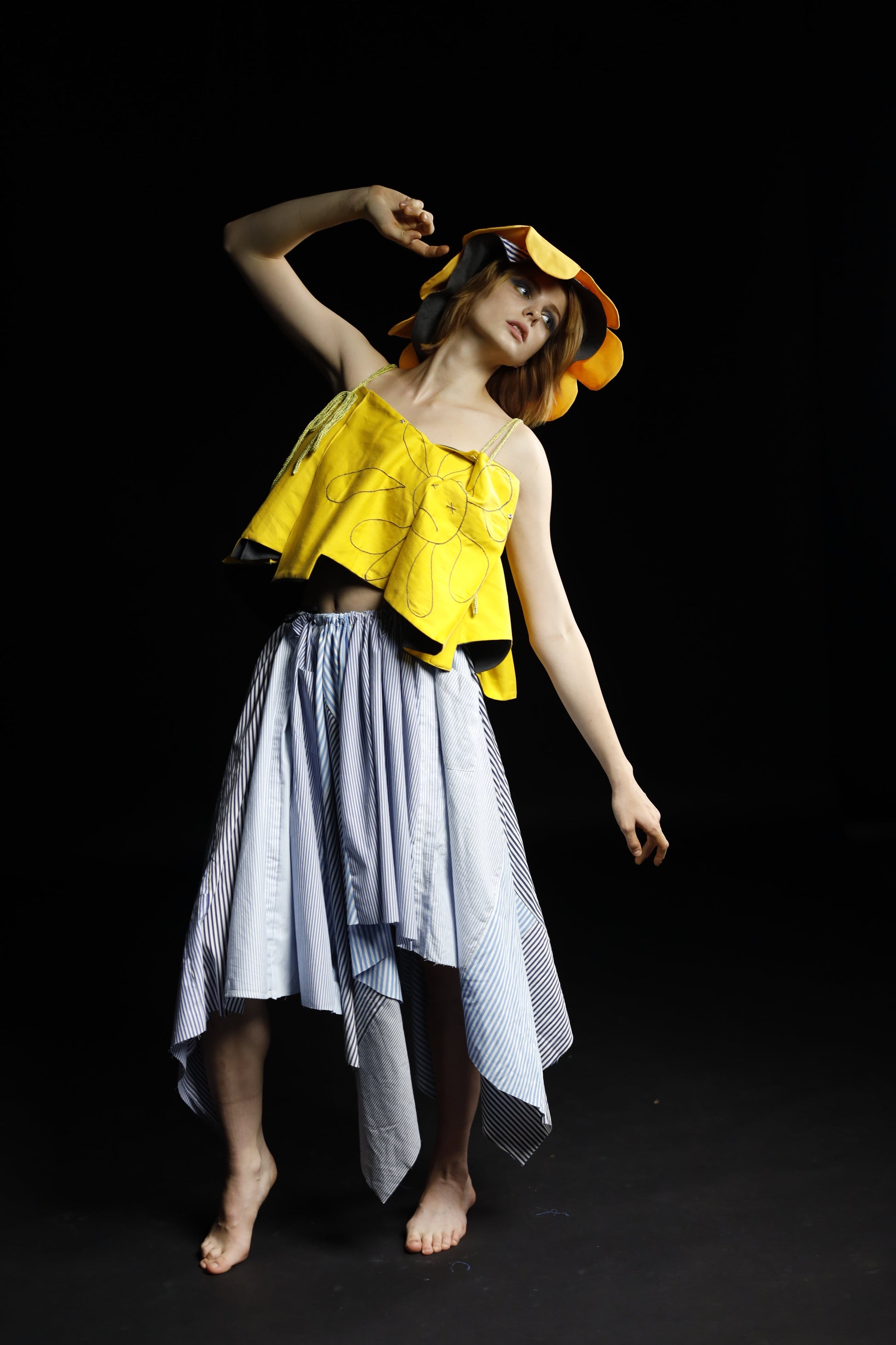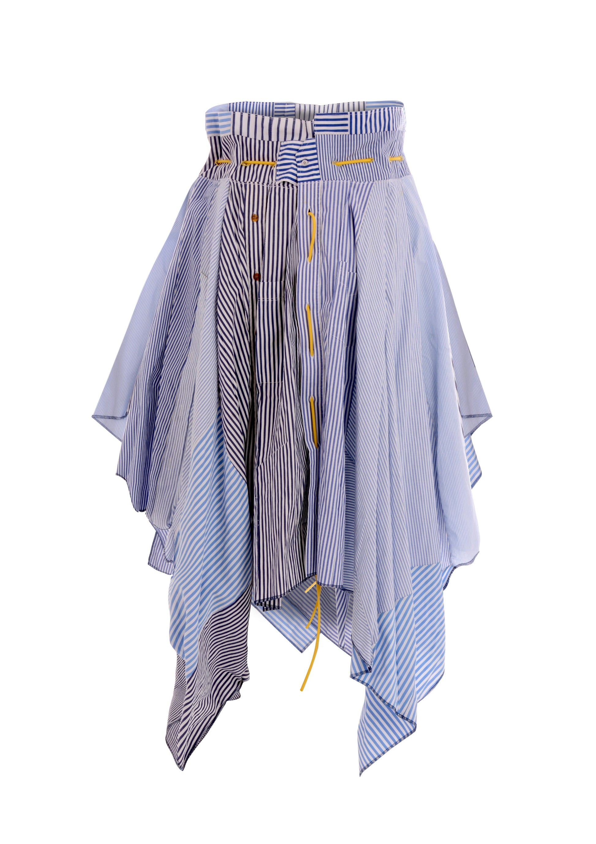 Die Petaled Rock-Hose aus der Kollektion LESS ist ein cooles, beeindruckendes Stück, das Sie als Rock oder Hose tragen und mit gelben Kordeln und Knöpfen anpassen können. Es besteht vollständig aus Reststoffen unserer textilen Konsumabfälle. Größtenteils aus Baumwolle und einem kleinen Anteil synthetischer Materialien, aus alten blau-weiß gestreiften Hemden. Jedes Stück ist ein Unikat, sieht aber nahezu identisch aus.