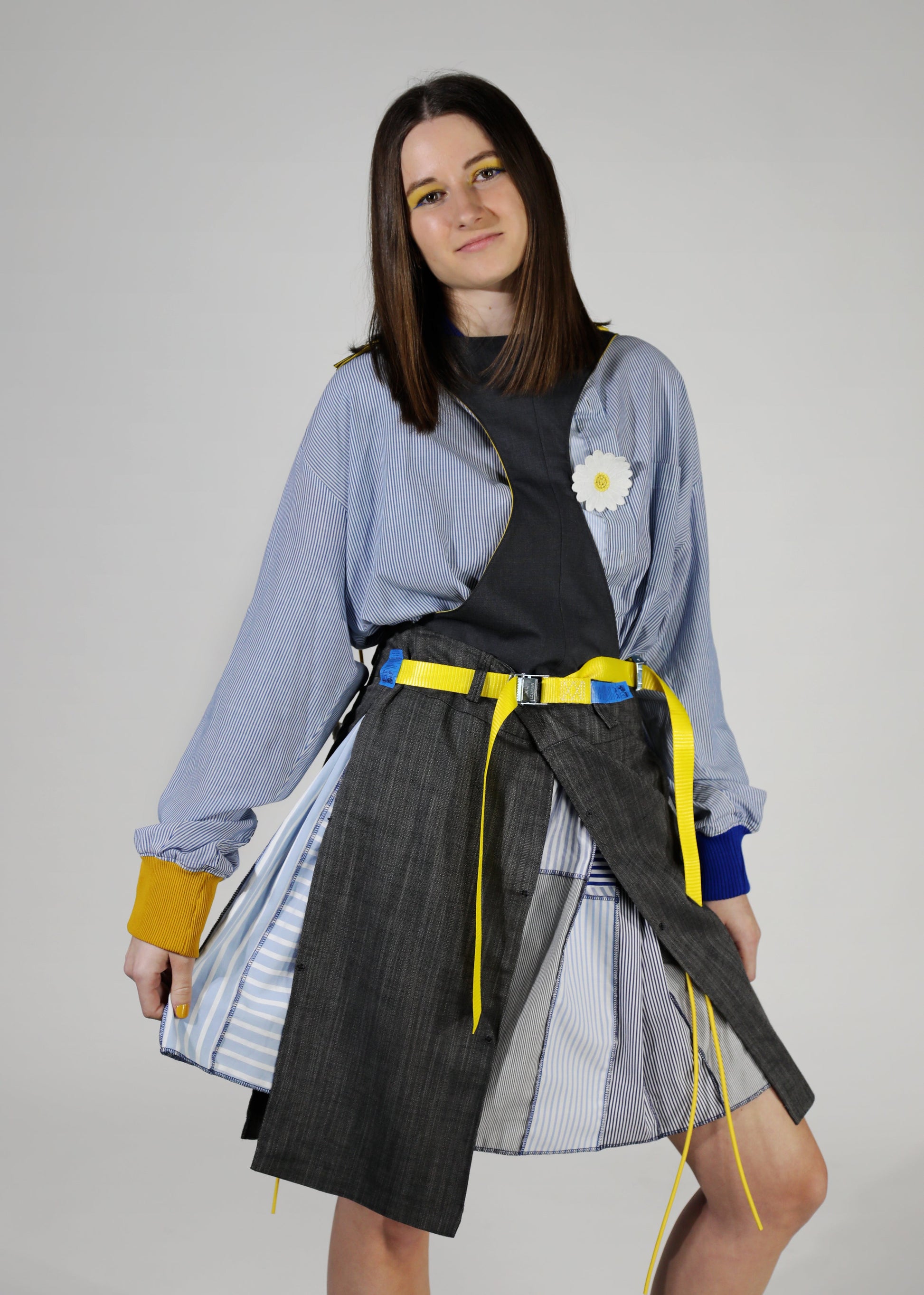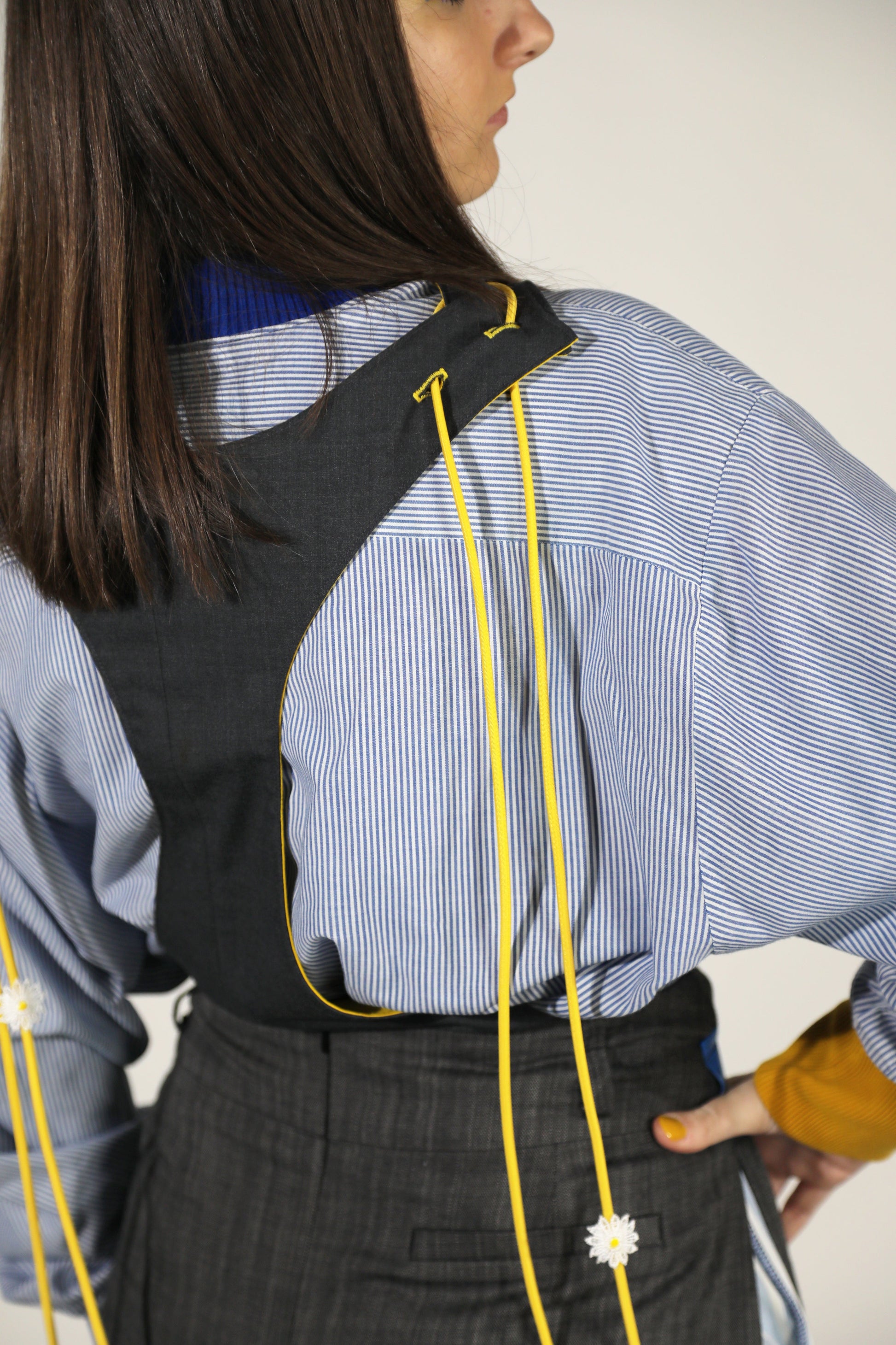 Der Shaper aus der Kollektion LESS ist ein cooles Accessoire, das Sie über anderen Kleidungsstücken tragen können und das Sie mit gelben Kordeln und Blumenstoppern an Ihren Körper anpassen können. Es besteht vollständig aus Reststoffen unserer textilen Konsumabfälle. Größtenteils aus Baumwolle und einem kleinen Anteil synthetischer Materialien. Jedes Stück ist ein Unikat, sieht aber nahezu identisch aus.