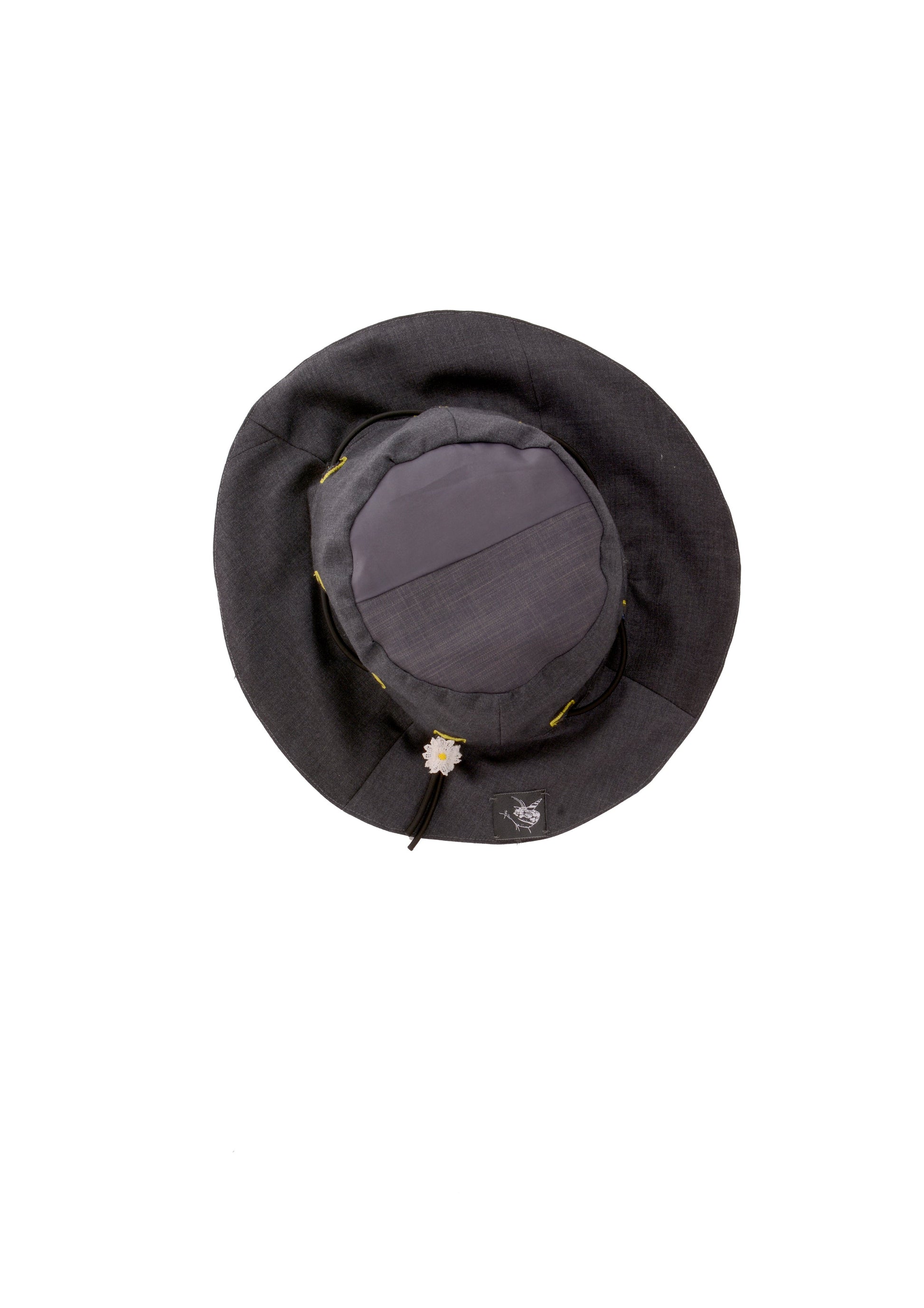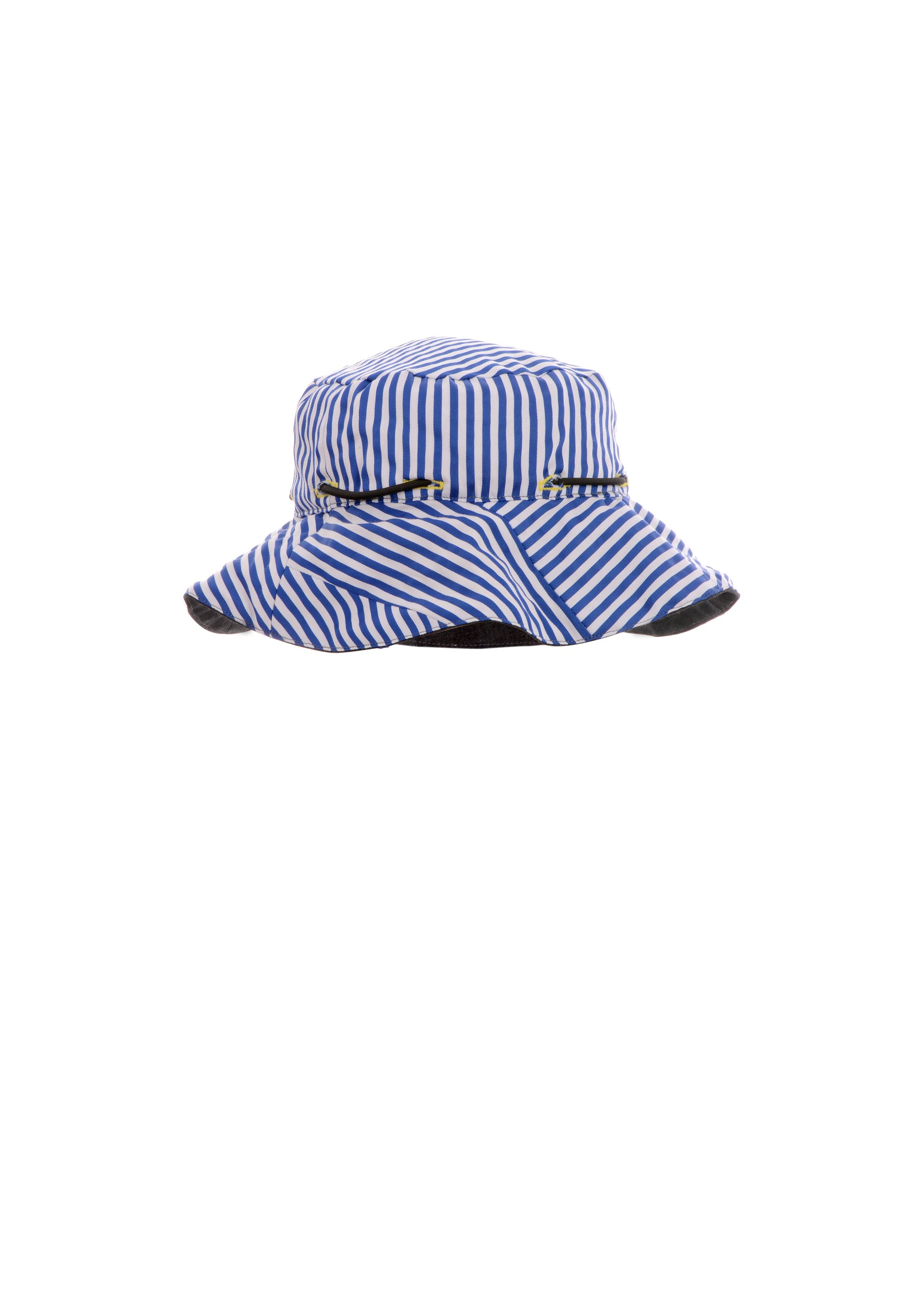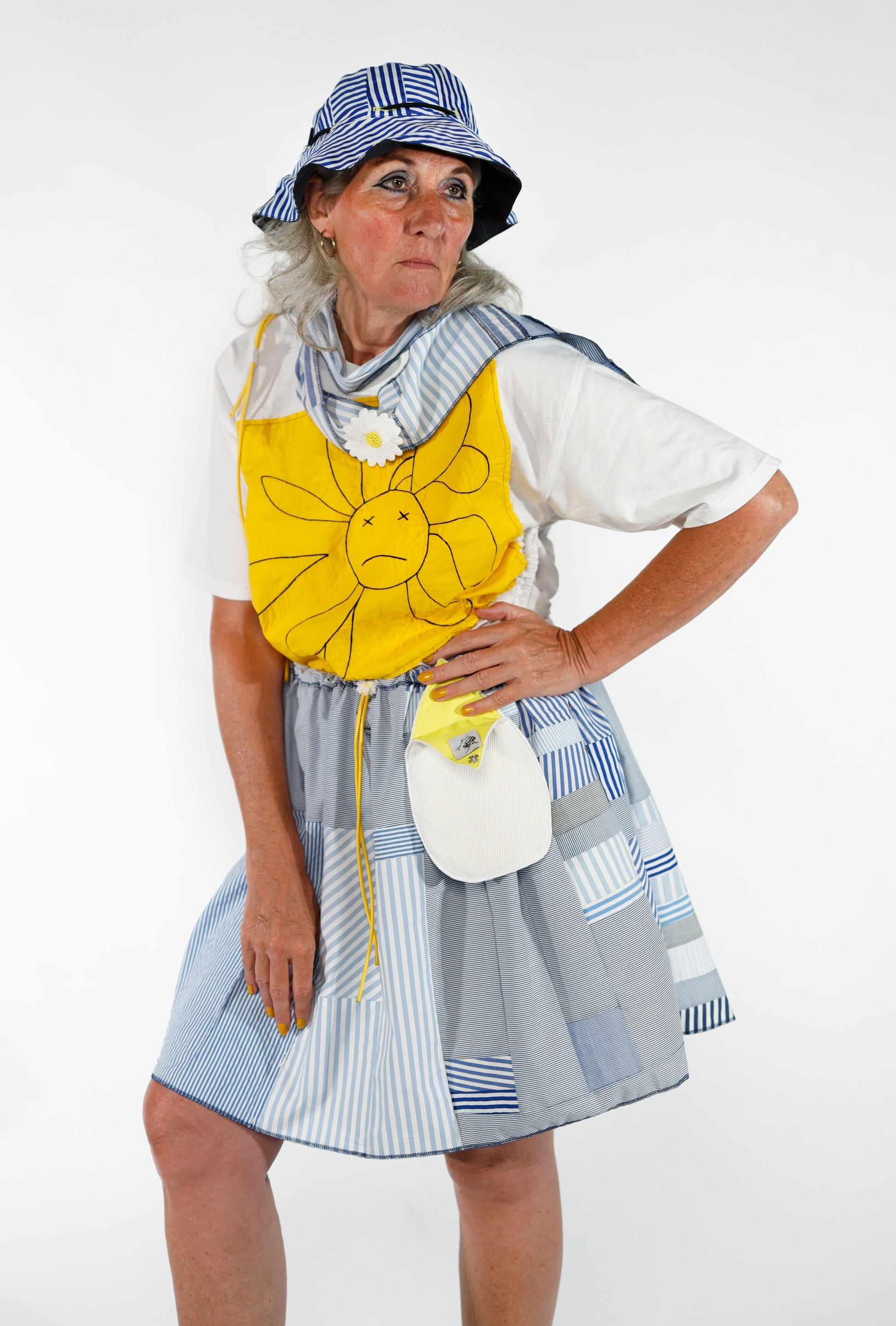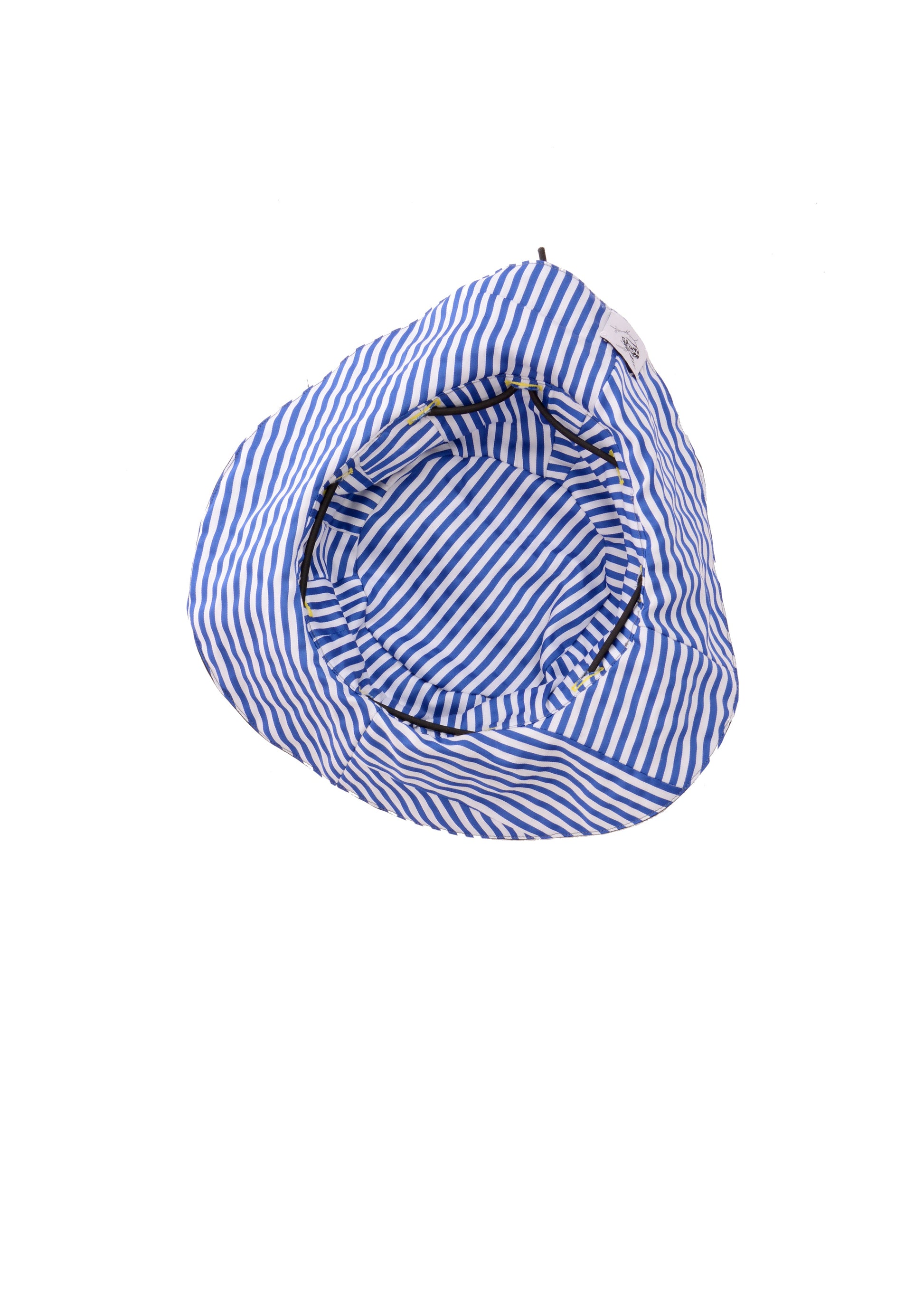 Der Ufo Bucked Hat aus der Kollektion LESS ist ein cooles Accessoire, das Sie beidseitig auf der blau-weiß gestreiften Seite oder auf der grauen Seite tragen können. Es besteht vollständig aus Reststoffen unserer textilen Konsumabfälle. Größtenteils aus Baumwolle und einem kleinen Anteil synthetischer Materialien. Dieser Hut ist speziell aus Eigenproduktionsresten alter Hemden und Anzüge gefertigt. Jedes Stück ist ein Unikat, sieht aber nahezu identisch aus.