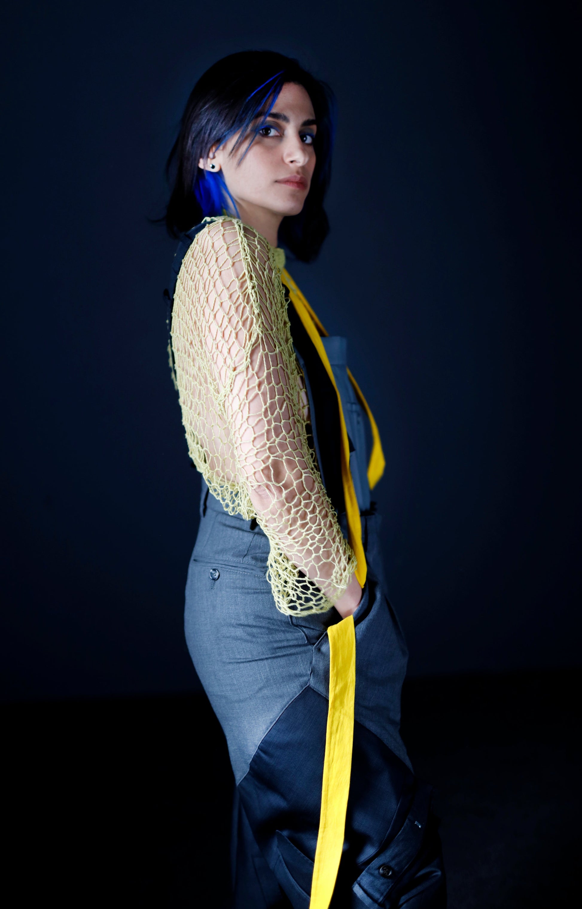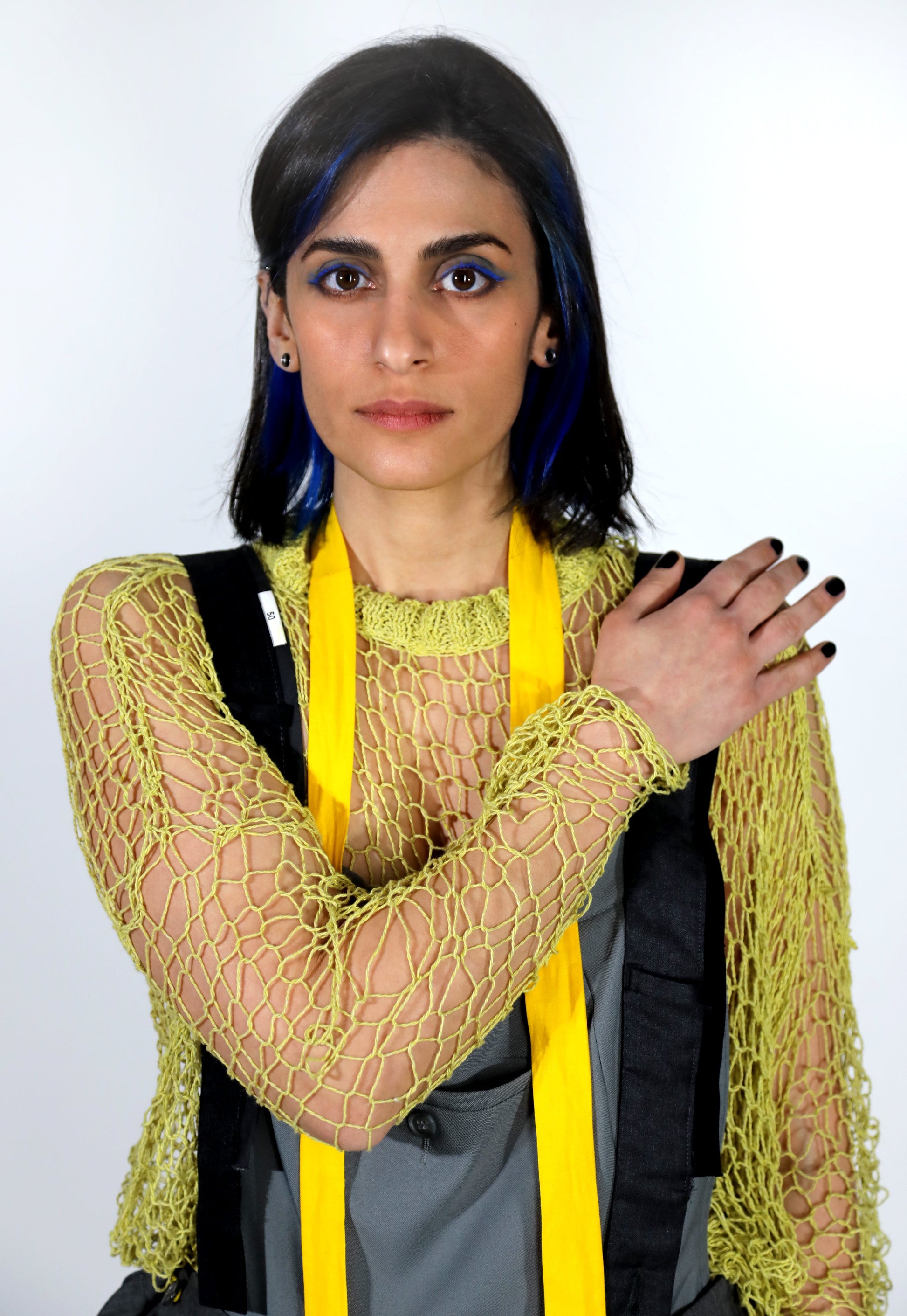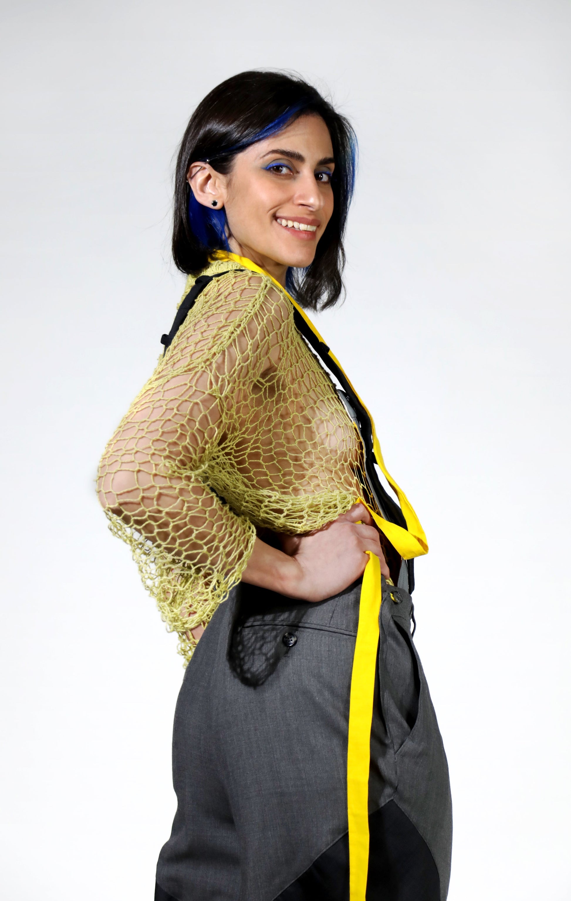 Der gelbe Pullover aus der Kollektion LESS ist ein cooler, hellgelber Strickartikel, den Sie über oder unter anderer Kleidung tragen können. Es besteht aus recycelter Baumwolle. Jedes Stück ist ein Unikat, sieht aber nahezu identisch aus.