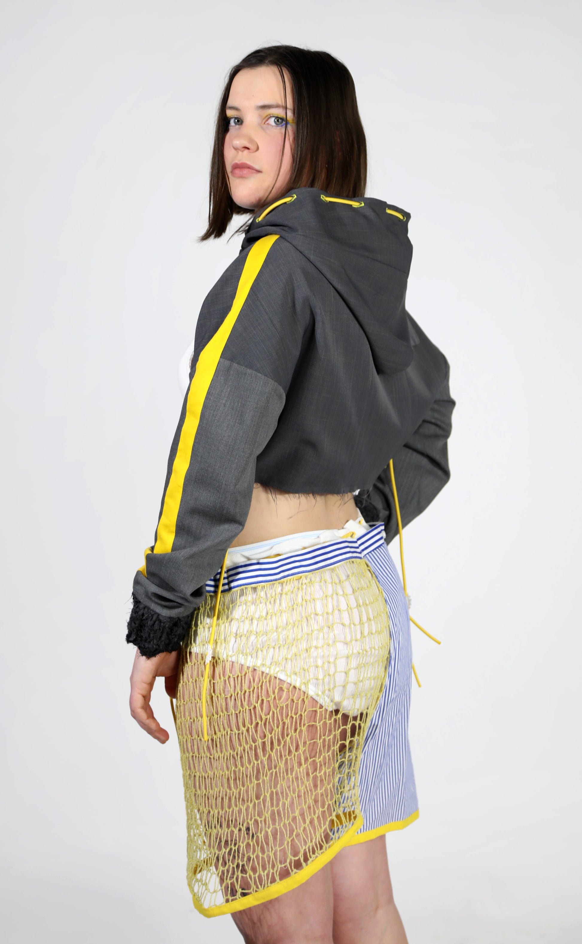 El "Badass Boxer" de la colección LESS es una prenda moderna y llamativa que puedes llevar en la cadera o en la cintura con un cordón adaptable. Está fabricado íntegramente con materiales sobrantes de nuestros residuos de consumo textil. Principalmente de algodón y un pequeño porcentaje de materiales sintéticos. Cada pieza es única, pero parece casi idéntica.