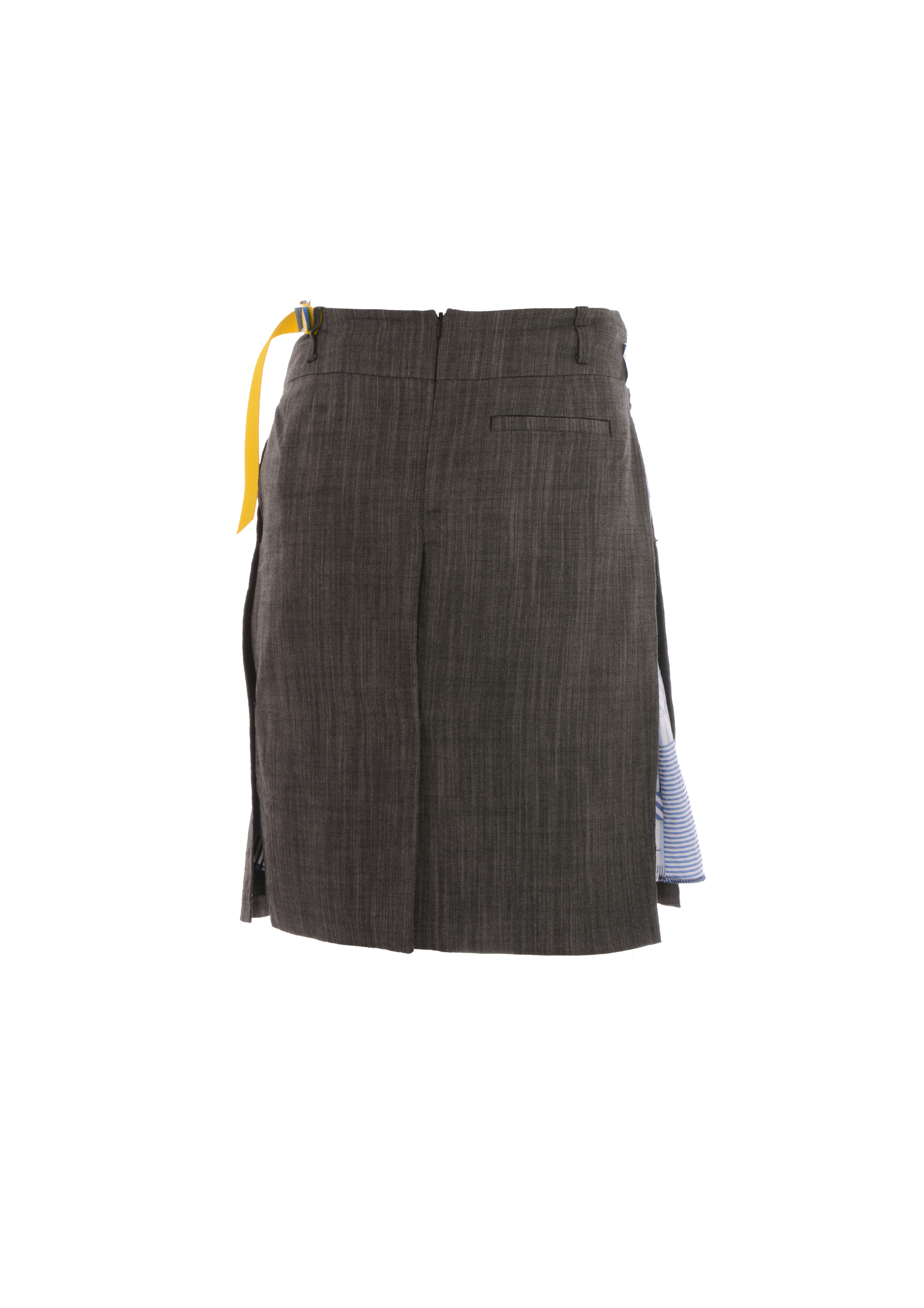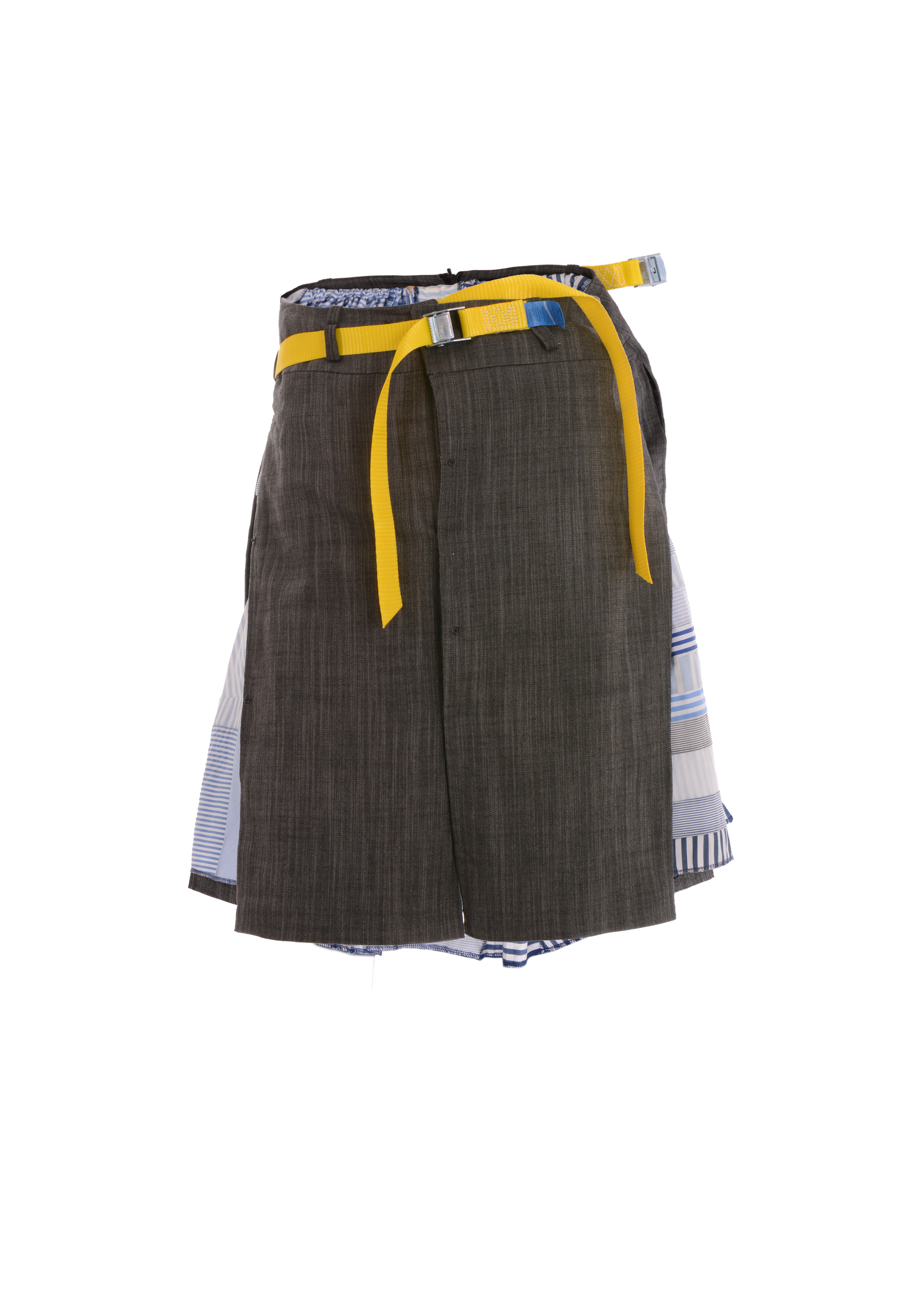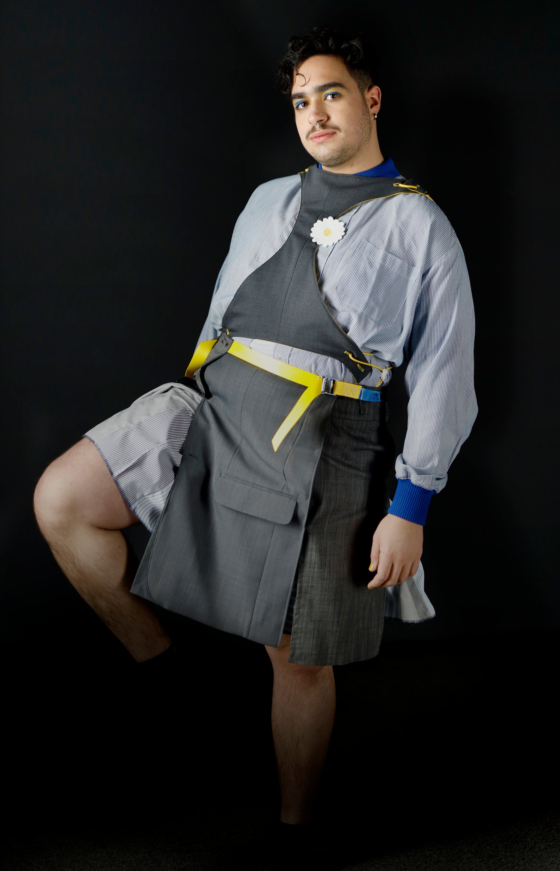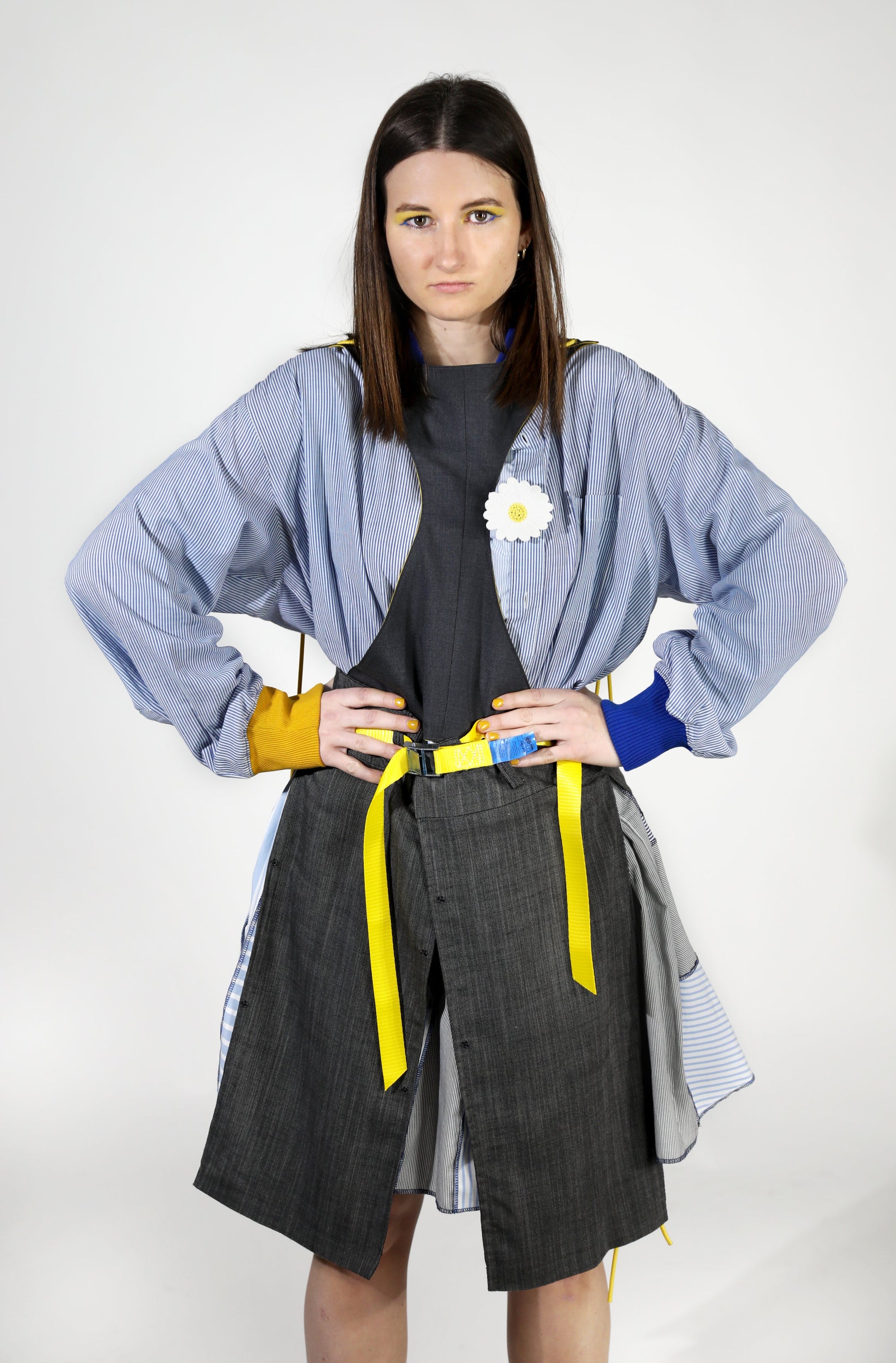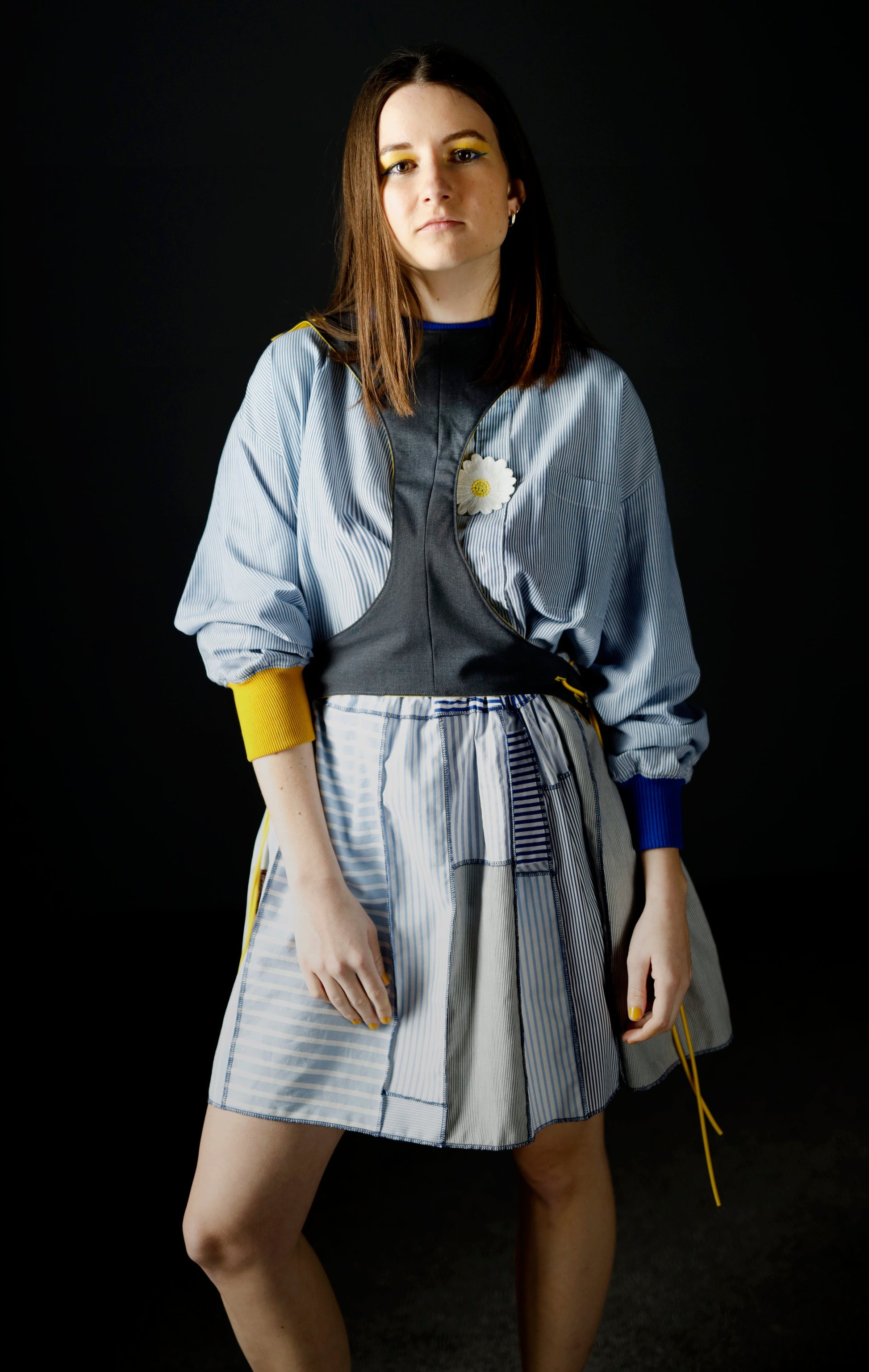 La falda se compone básicamente de dos piezas: una enagua con camisas viejas de rayas azules y la parte superior con trajes y pantalones de traje reciclados.