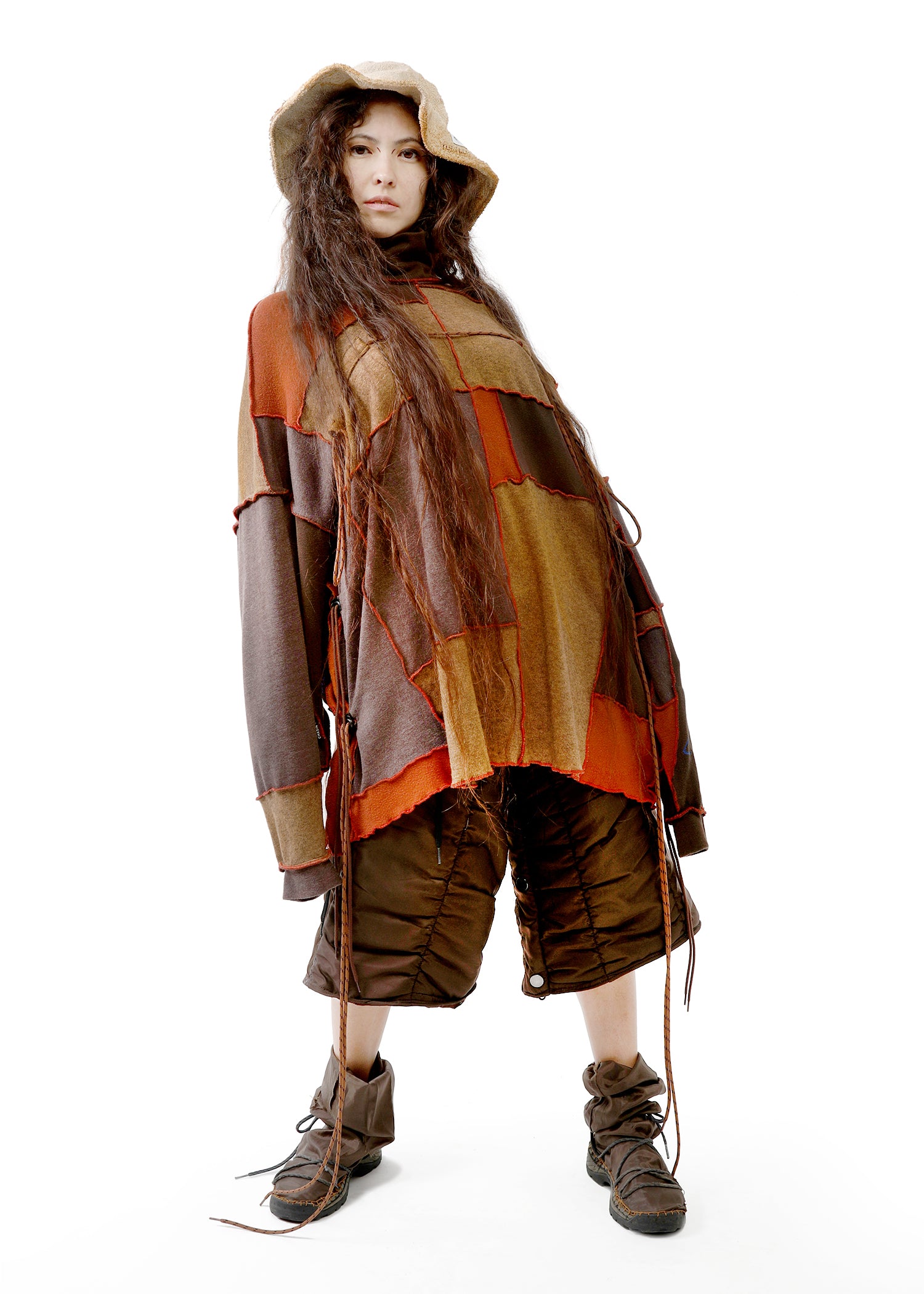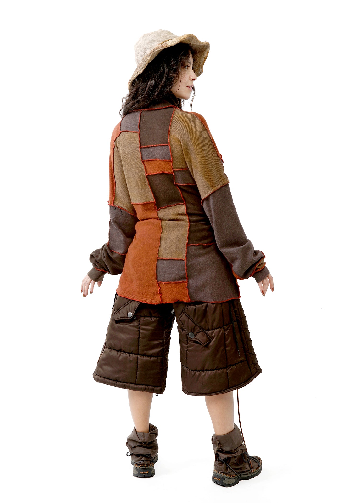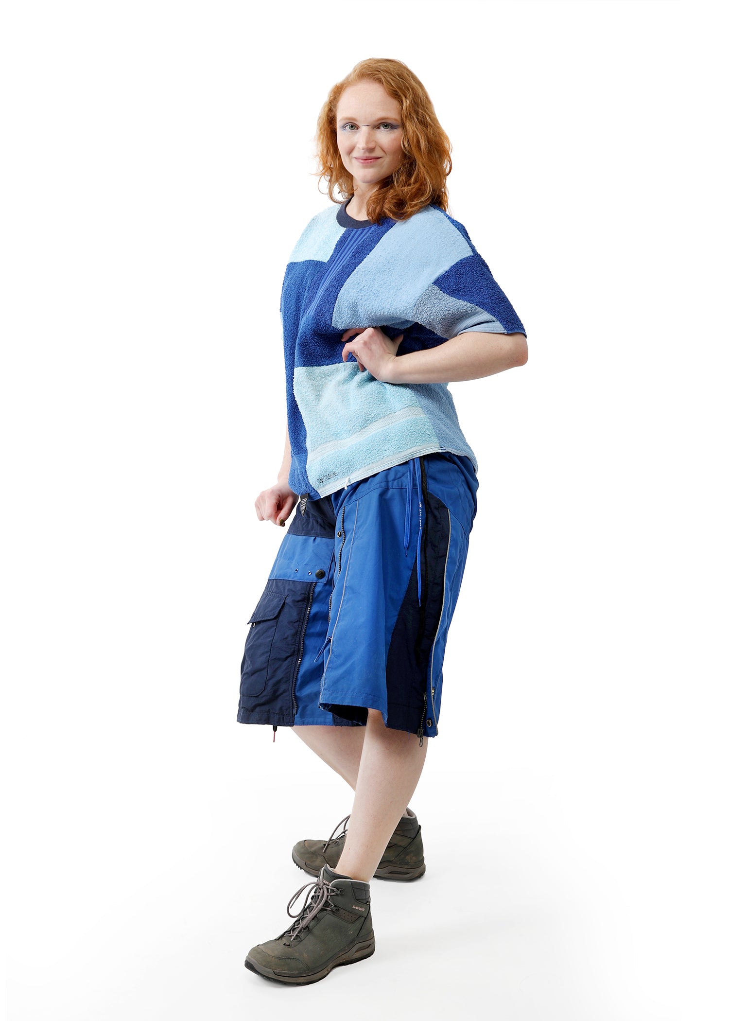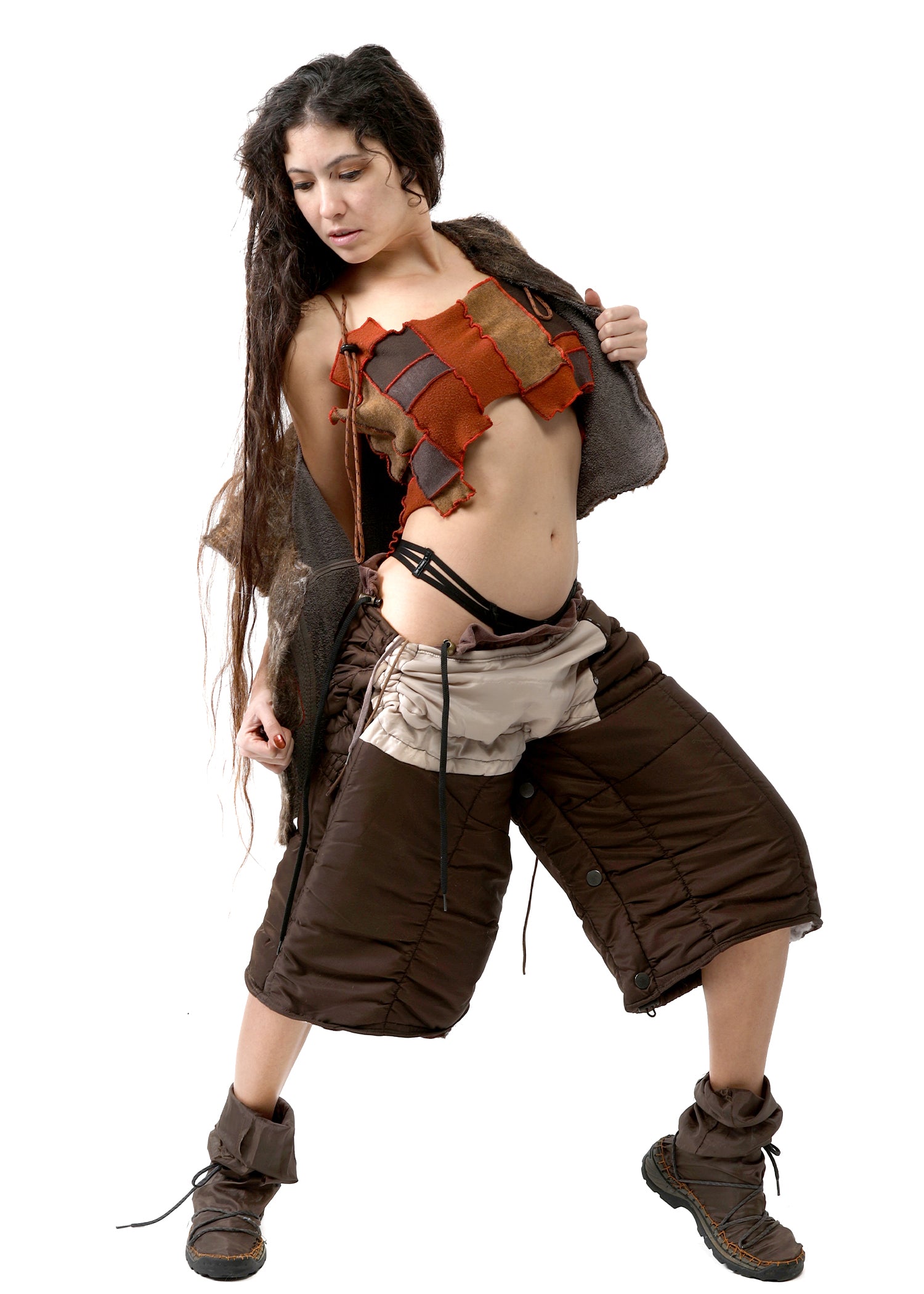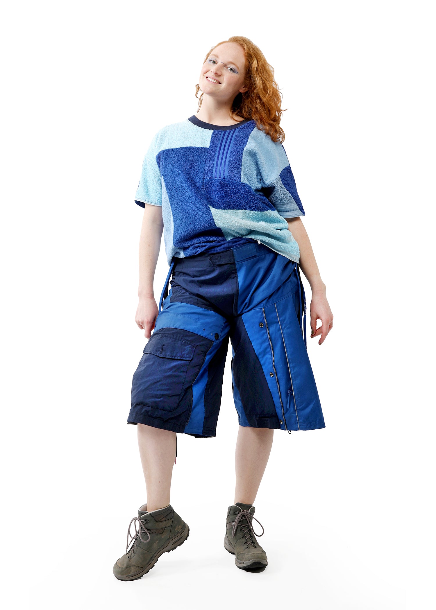 Estos pantalones reciclados y unisex están hechos de ropa outdoor seleccionada, tienen un largo de tres cuartos y un ajuste especial en el trasero, lo que los hace modernos y adecuados para la calle y el exterior. Con una estética ligeramente apocalíptica y distópica, estos pantalones brindan una apariencia única y elegante.