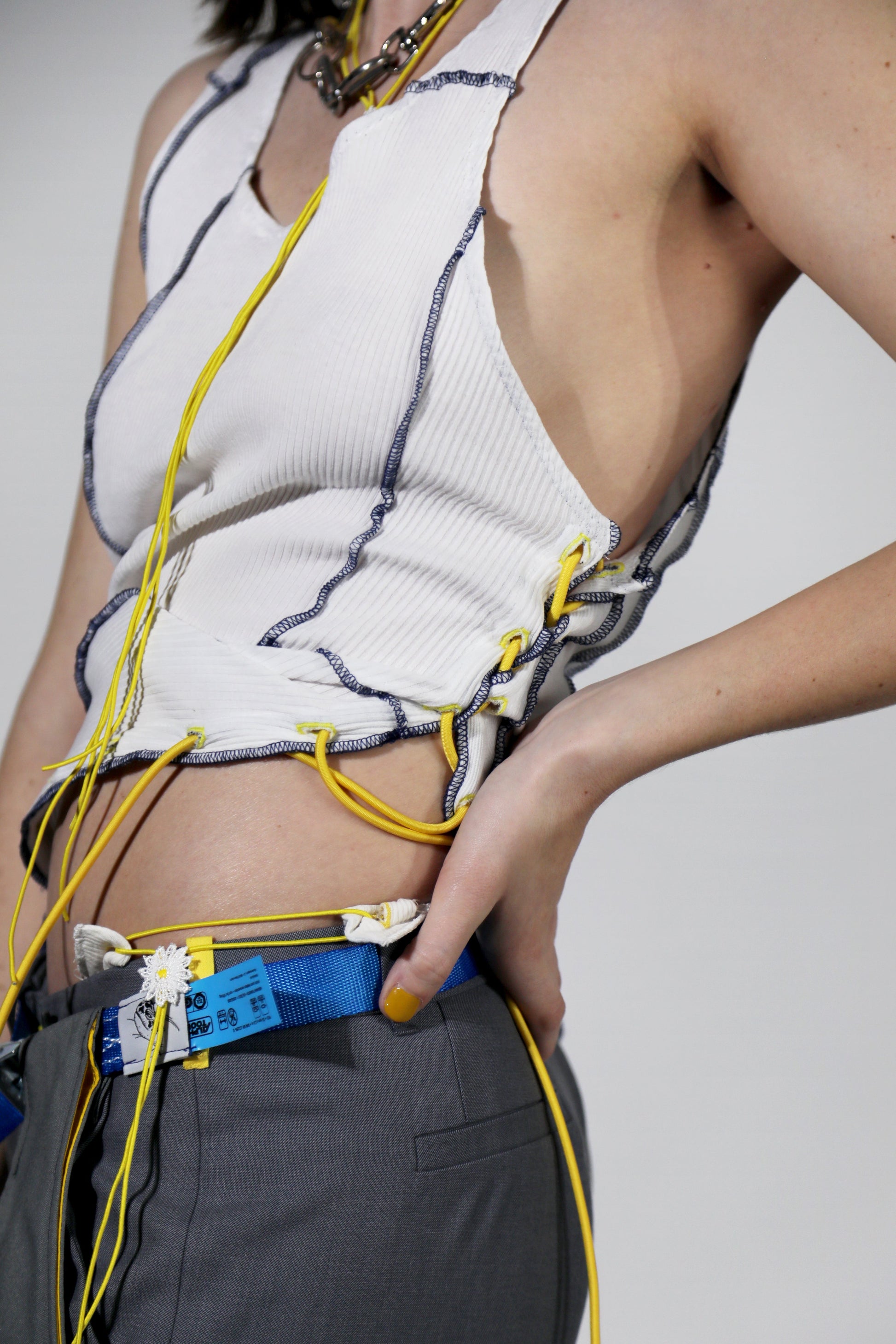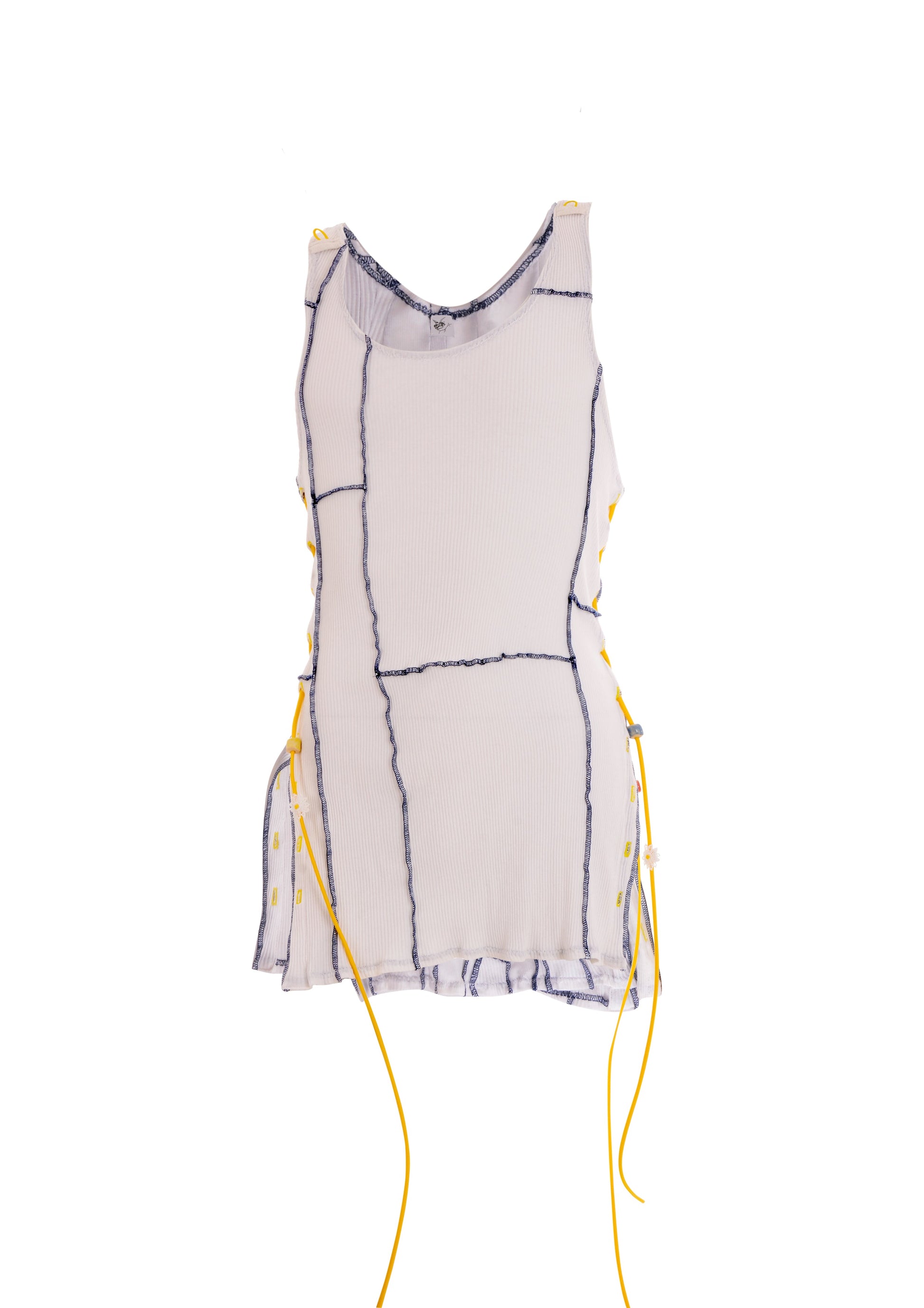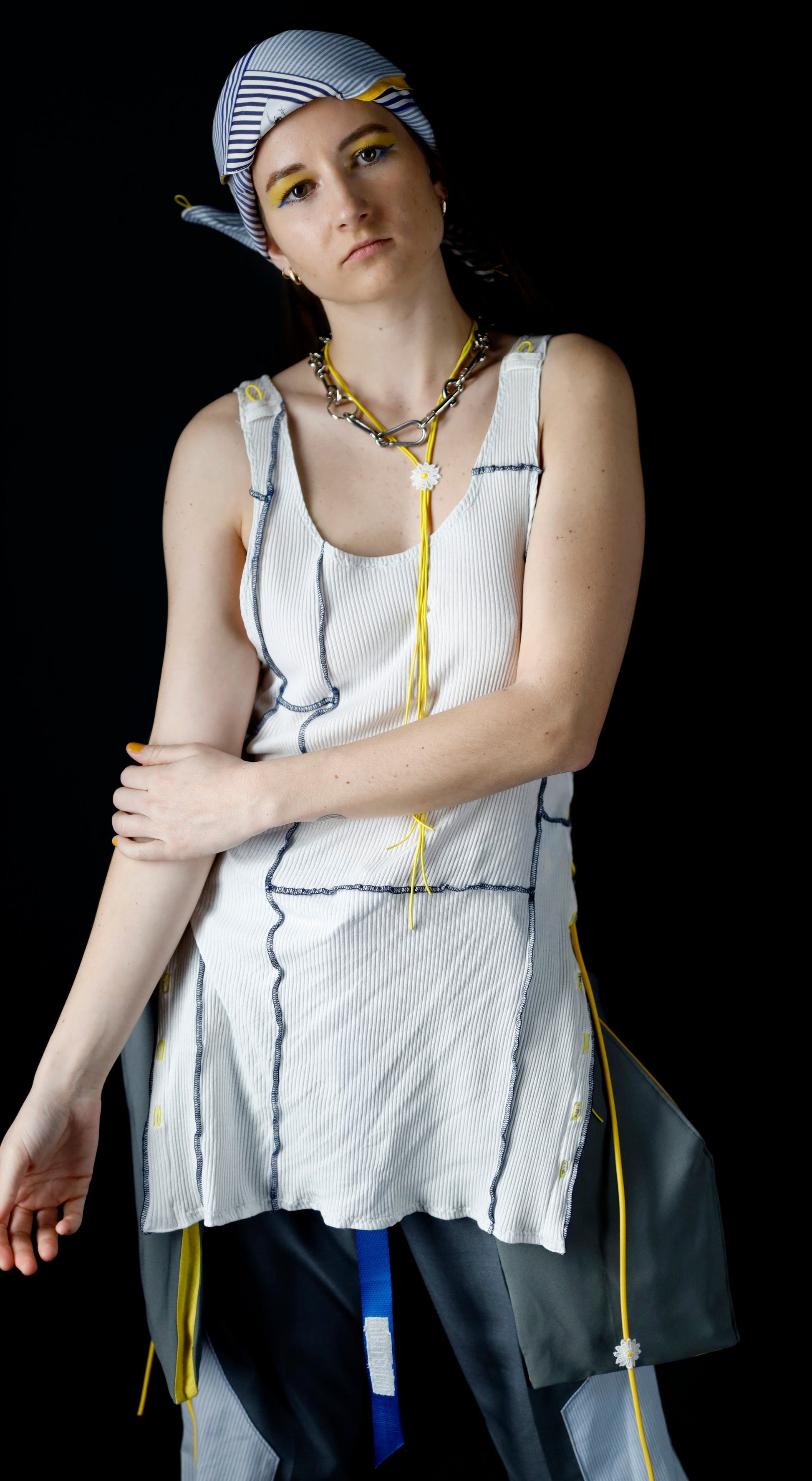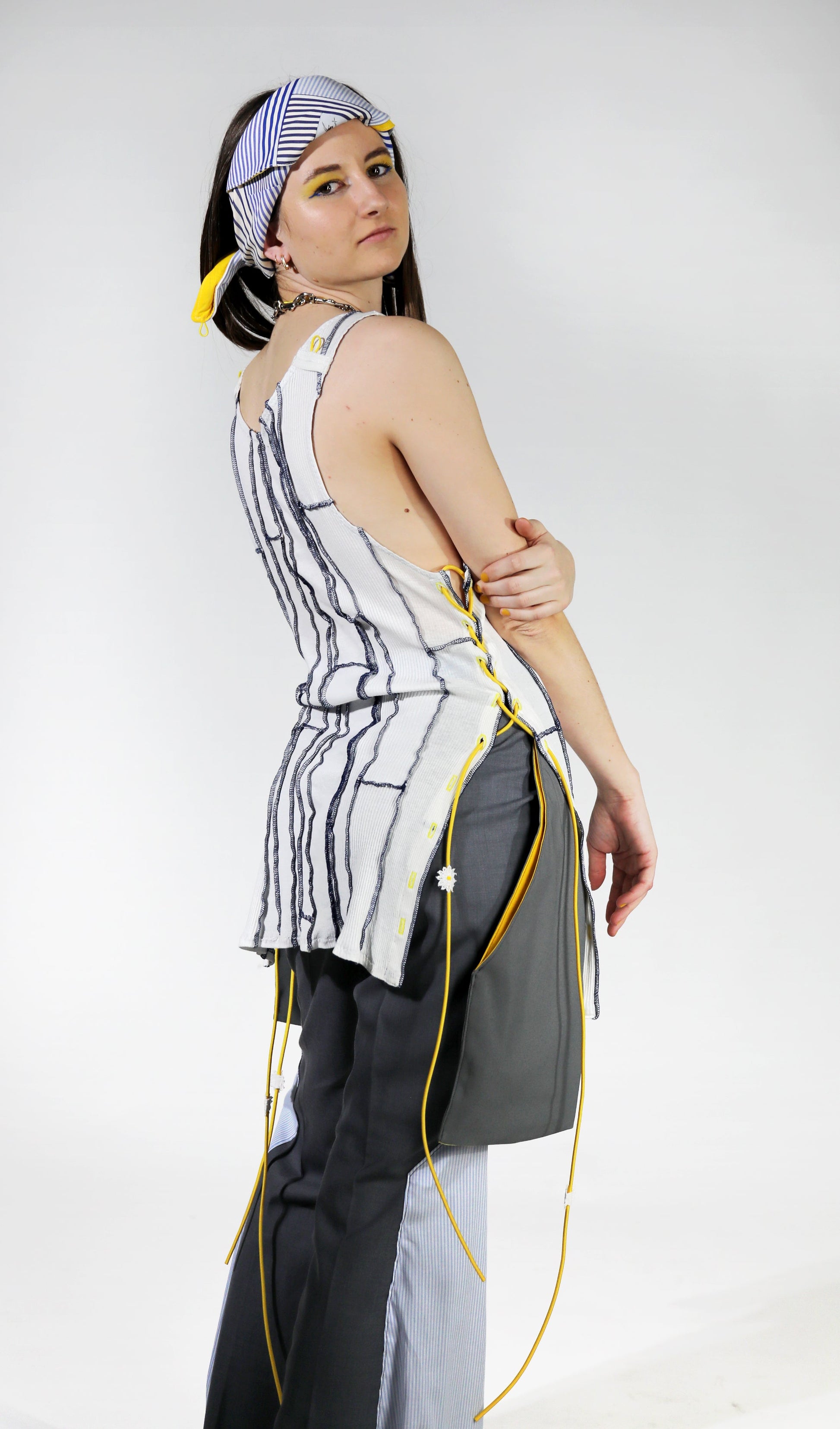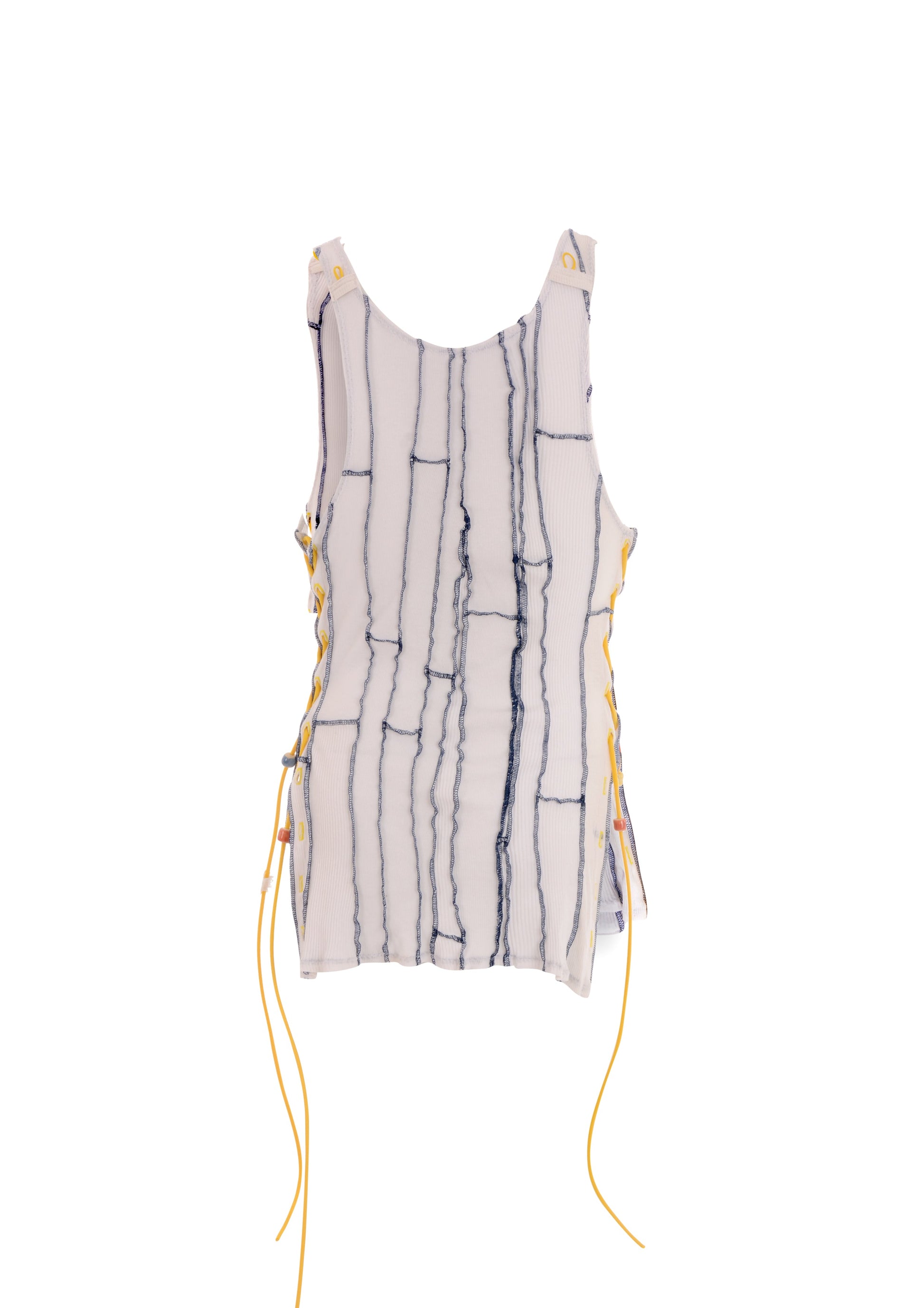 La camiseta interior "Sluggy Rib Undershirt" de la colección LESS es una prenda moderna e impresionante, puedes usarla más larga o más corta, más ancha o más ajustada, adaptándola con cordones y botones amarillos. Está fabricado íntegramente con materiales sobrantes de nuestros residuos de consumo textil. Principalmente de algodón y un pequeño porcentaje de materiales sintéticos. Cada pieza es única, pero parece casi idéntica.