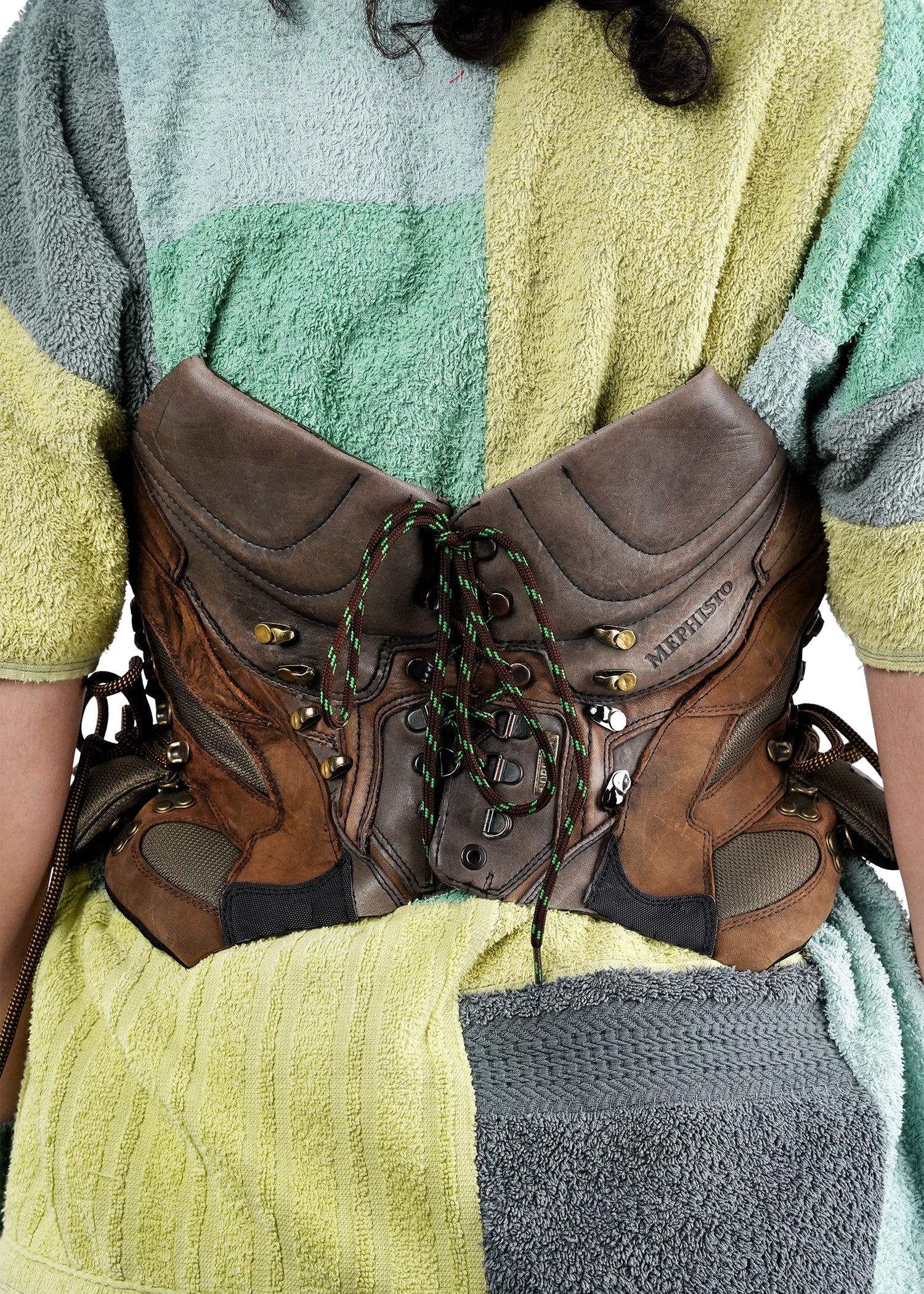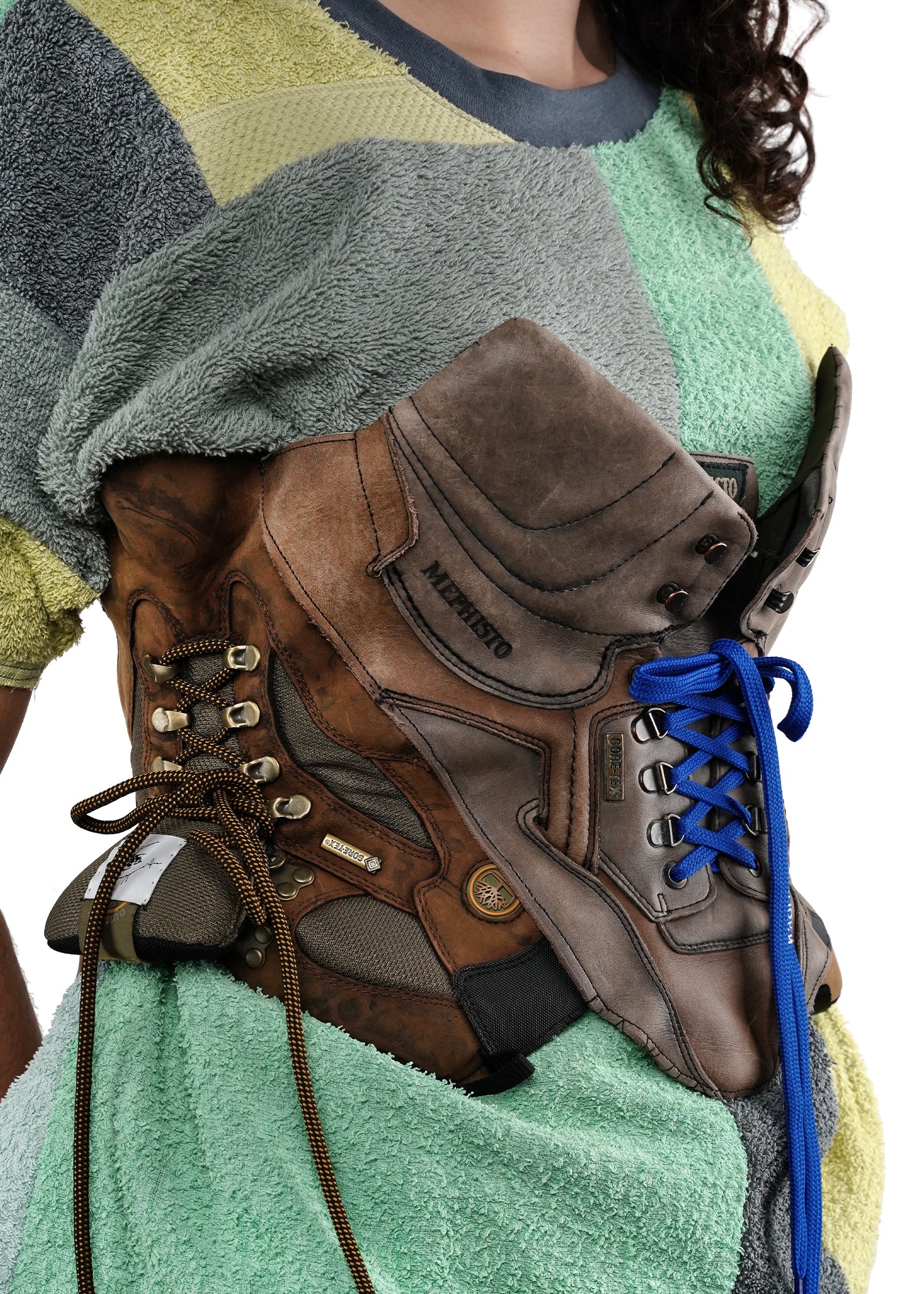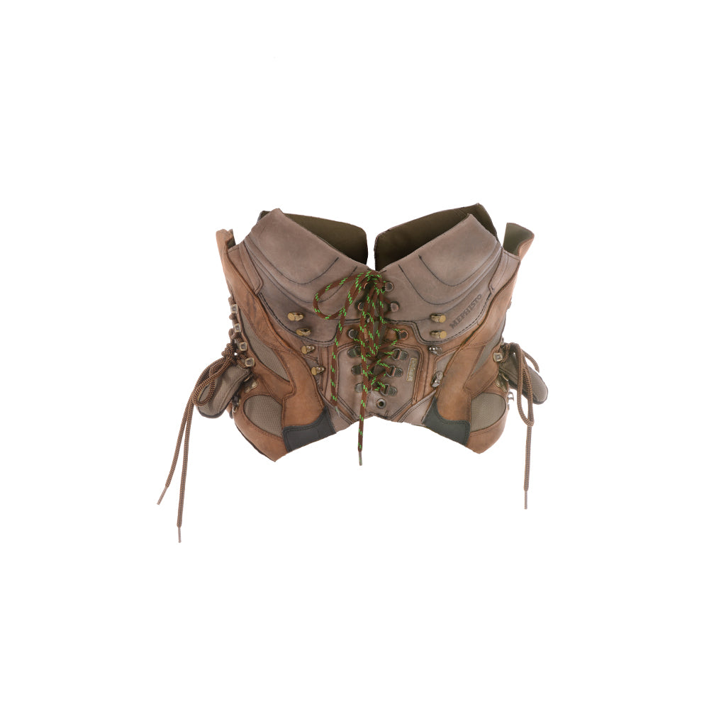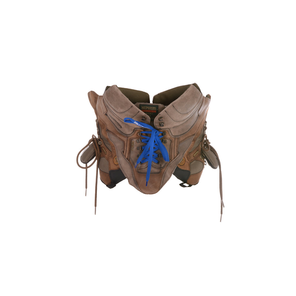 The Shoe Corsage is a perfect blend of streetwear style and gorpcore design. Made with alternative leather and out of mountain shoes, each corsage is unisex and adaptable to any size with cords from every side.